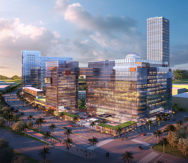 从空中俯瞰,建筑群布局规整又不失灵动,棕榈树点缀的街道与车流,烘托出活力商务氛围。无论是办公、商业场景,都在现代美学与实用功能的融合中,打造出适配城市发展节奏的综合性商务空间,助力激活区域经济活力 。
