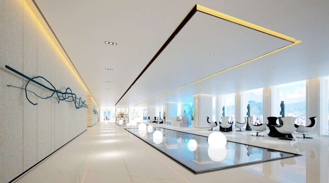 办公区延续简洁风格,通透玻璃墙引景入室,将城市风光与自然光线融入工作场景。灯光设计暗藏巧思,线性灯带勾勒空间轮廓,球形地灯增添灵动。艺术装置点缀墙面、地面,打破单调,让理性办公空间兼具人文温度,诠释现代企业总部的高效与格调 。