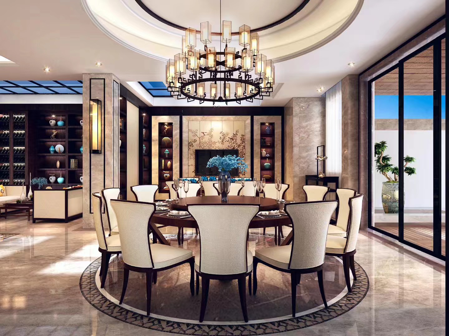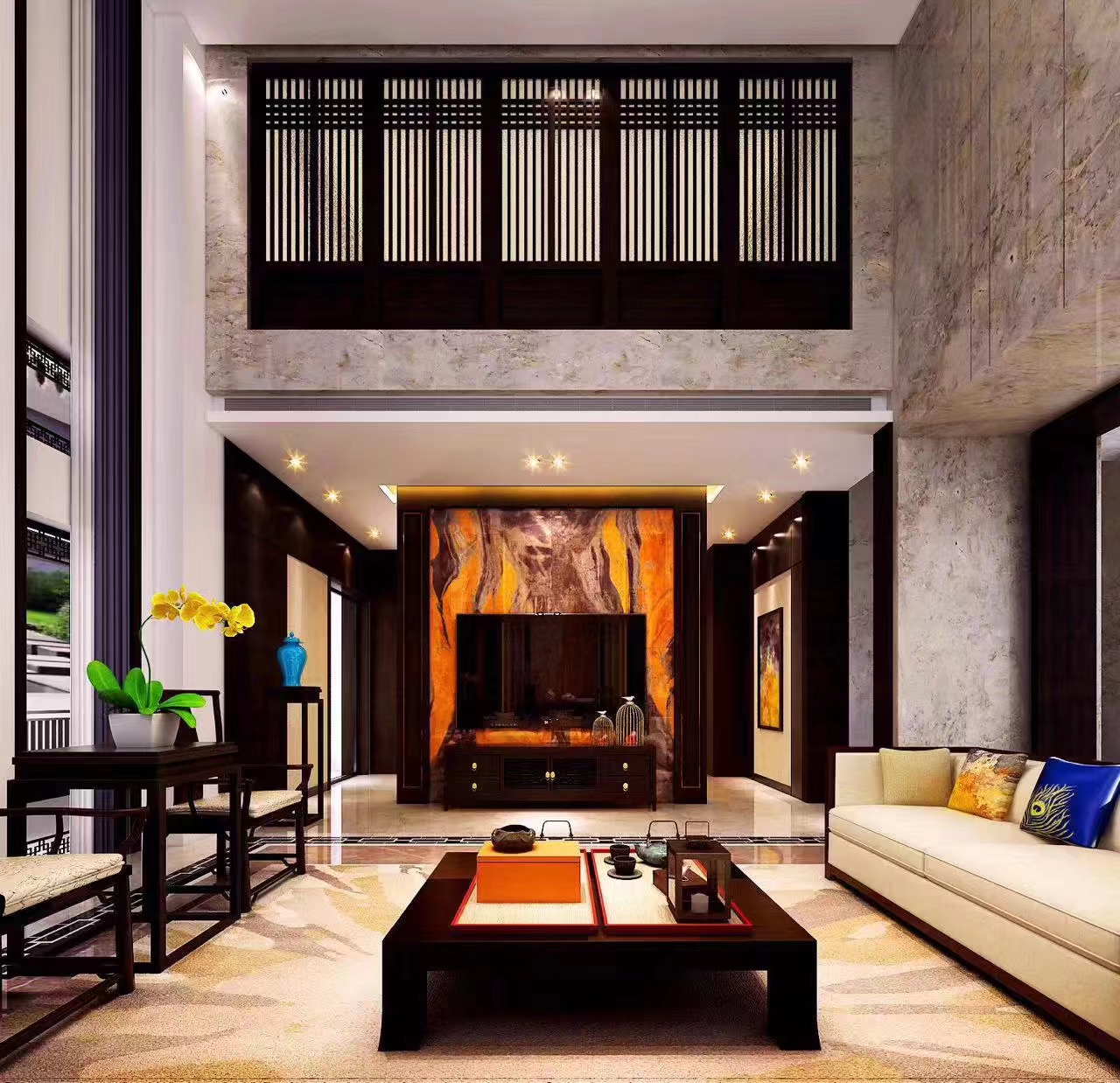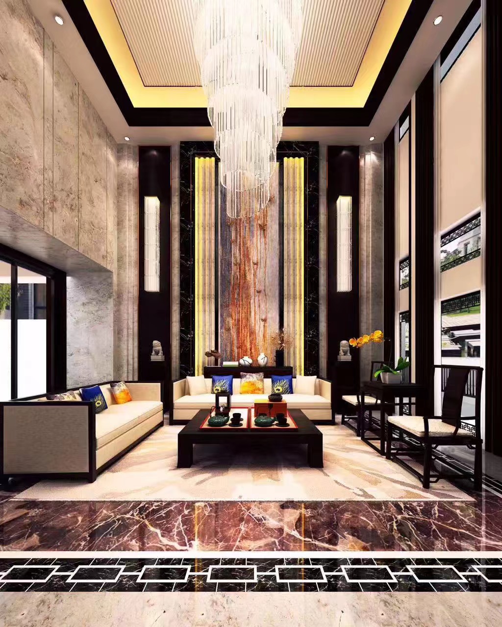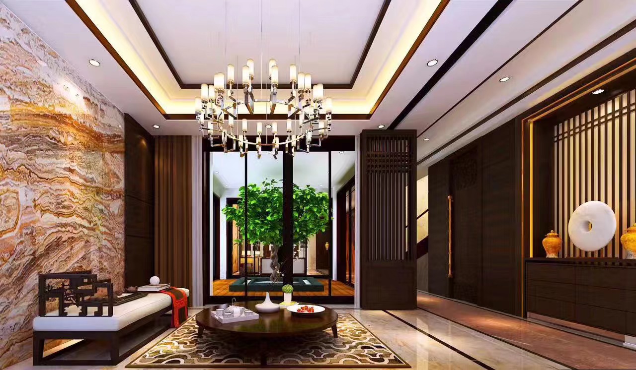 整体设计通过材质、布局与装饰的交融,在现代居住需求中,诠释新中式的文化底蕴与空间美学,打造出既符合当代生活,又饱含东方意境的高端别墅居所 。