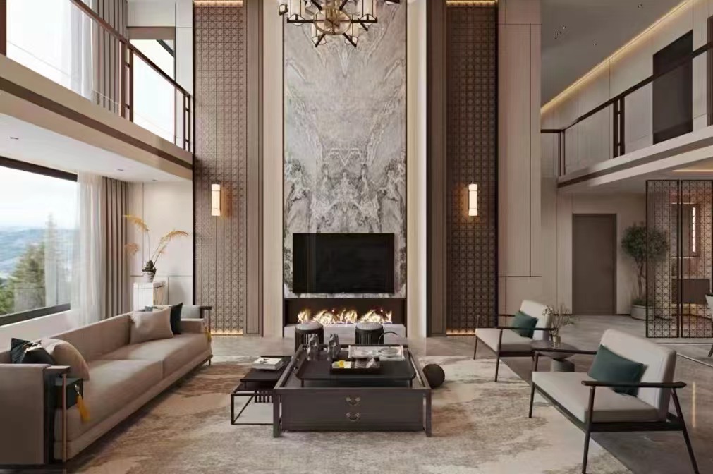 挑高客厅是空间亮点,大理石背景墙如自然山水长卷,搭配金属格栅与暖光壁灯,层次丰富;悬浮式壁炉增添温馨烟火气,浅色系沙发、简约茶几,在宽敞空间里营造出松弛的社交氛围,大面积玻璃窗引入室外景致,让自然与室内交融 。