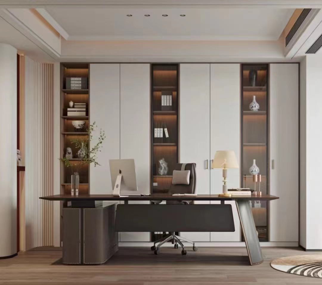 在独立办公区,以简洁的灰白柜体为背景,嵌入深色开放格,内置暖光营造温馨氛围,陈列的书籍、器物,彰显主人品味;简约大气的办公桌搭配舒适座椅,形成专注高效的工作场景,同时与整体空间风格和谐统一 。