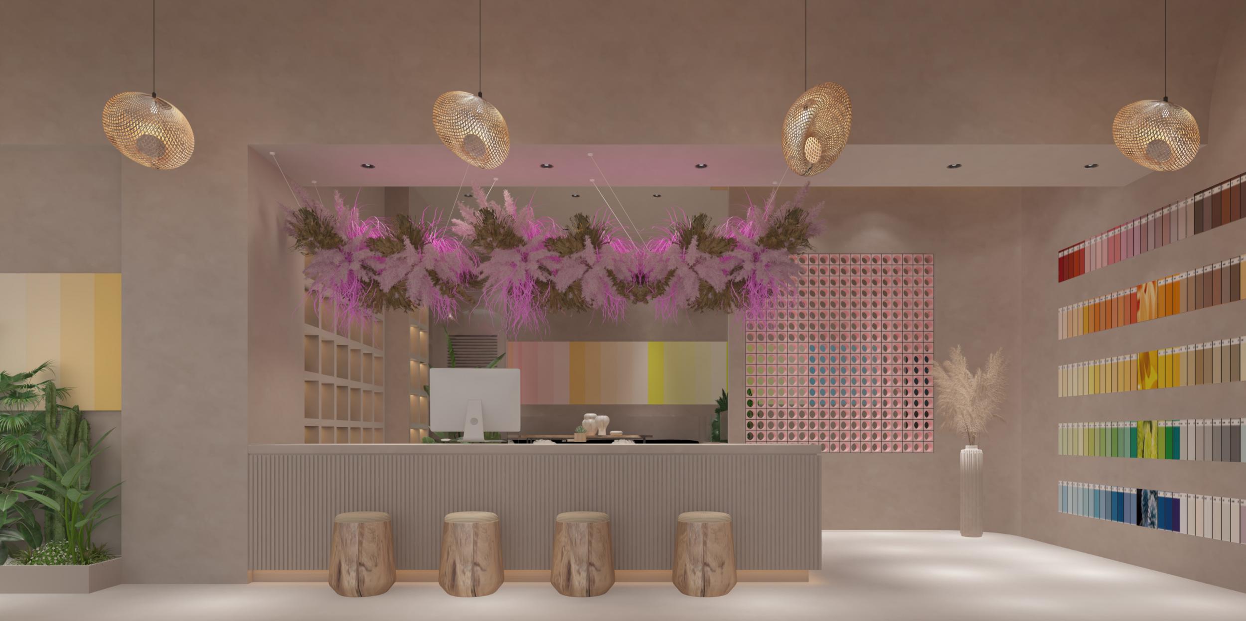 艺术涂染展厅设计,以 “自然融合、色彩叙事、空间诗性” 为内核,重塑艺术涂料展示体验。整体空间采用柔和的大地色系基底,搭配温润木质与通透玻璃,构建自然松弛的氛围容器。