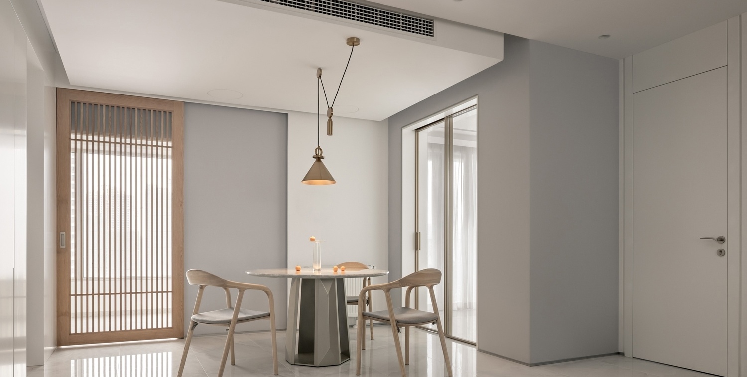客厅区域,圆弧顶面柔化空间边界,白色沙发搭配原木家具,自然材质传递温润质感;轻盈的纱帘、简约的吊灯,让光线成为空间的灵动画笔,勾勒出松弛的生活场景。餐厅延续极简风格,圆形餐桌、几何造型餐椅,搭配设计感吊灯,营造精致又舒适的用餐氛围,窗外光线倾泻而入,与室内柔和光感交融。