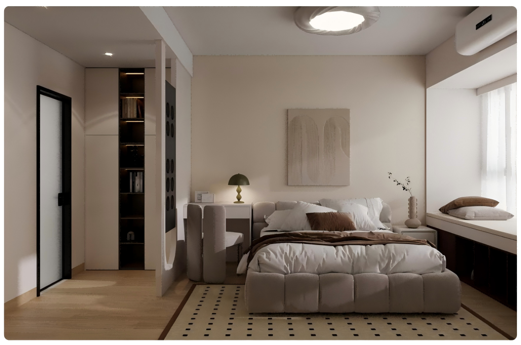 卧室:色调柔和,墙面、家具多为浅米色等温暖色系,搭配简约装饰画、温馨灯具,空间虽小但布局精巧,营造静谧休憩氛围 。