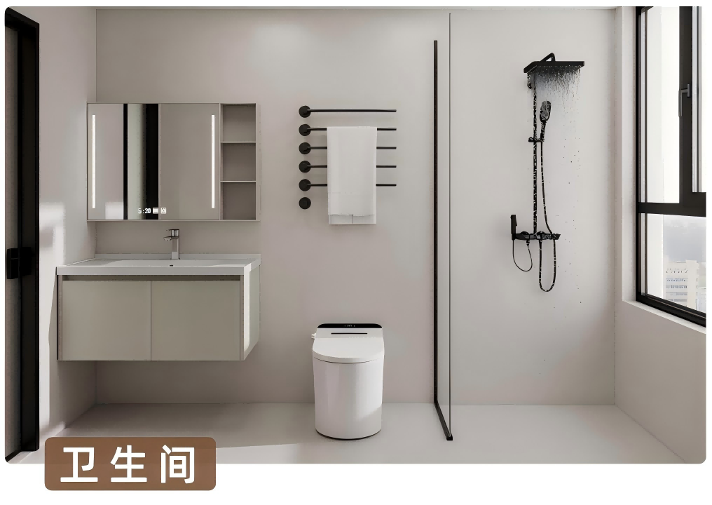 卫生间:以简洁白调为主,搭配黑色五金件,干湿区布局合理,智能马桶、镜柜等提升便利性与整洁感,尽显简约精致。