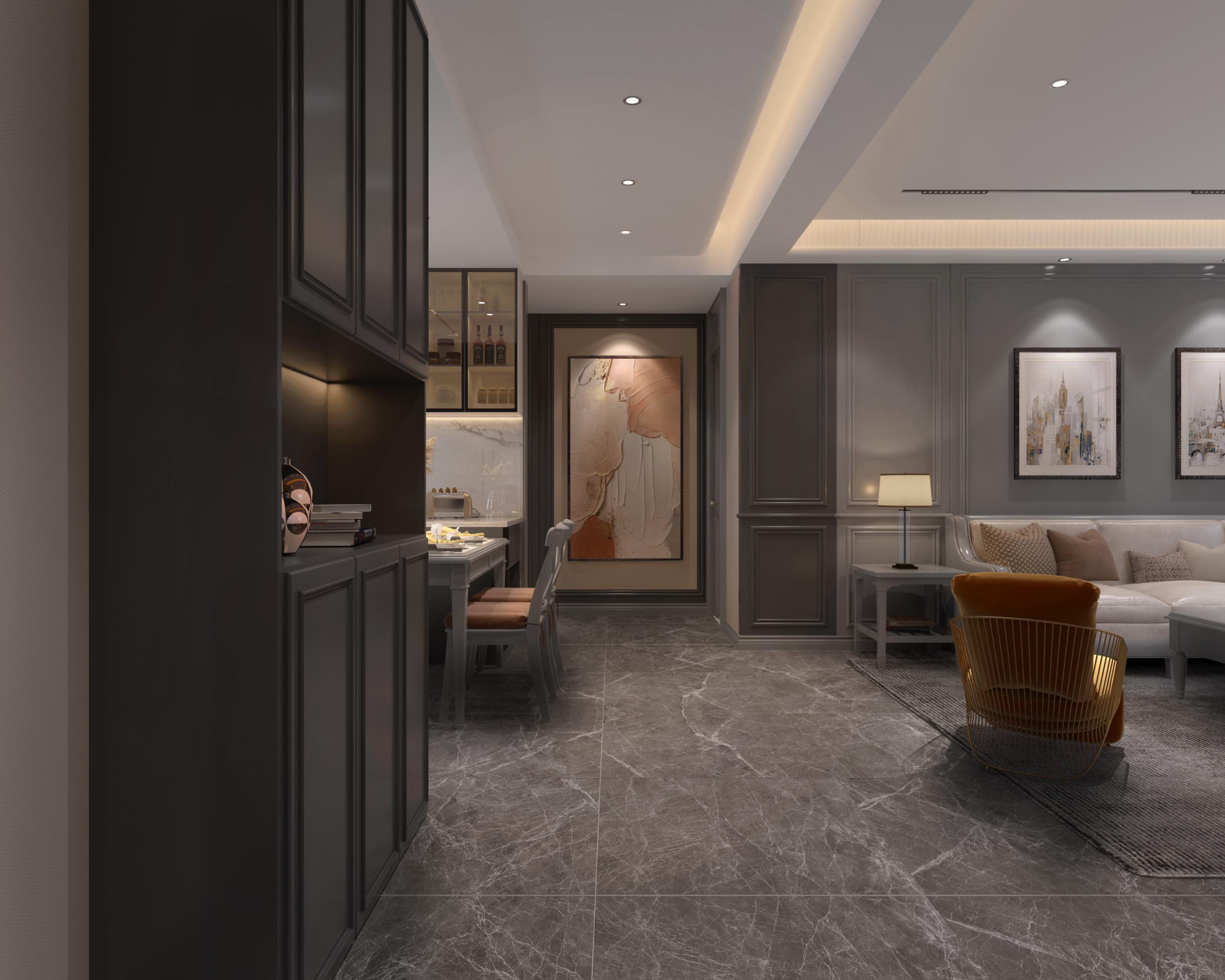 客餐厅打通为一体化空间,地面通铺深灰大理石瓷砖,复刻美式大宅的沉稳基底。客厅以深灰护墙板勾勒空间框架,搭配浅灰艺术漆墙面,营造层次。浅米色皮质沙发组合围合出社交核心,旁侧焦糖色单人椅点亮空间,复古金属吊灯垂坠,与大幅抽象挂画呼应,构建艺术氛围。餐厅延续深灰 + 浅木色系,定制餐边柜嵌入玻璃酒格,陈列珍藏酒具,长形餐桌搭配复古皮椅,适配家族聚餐与好友小酌。