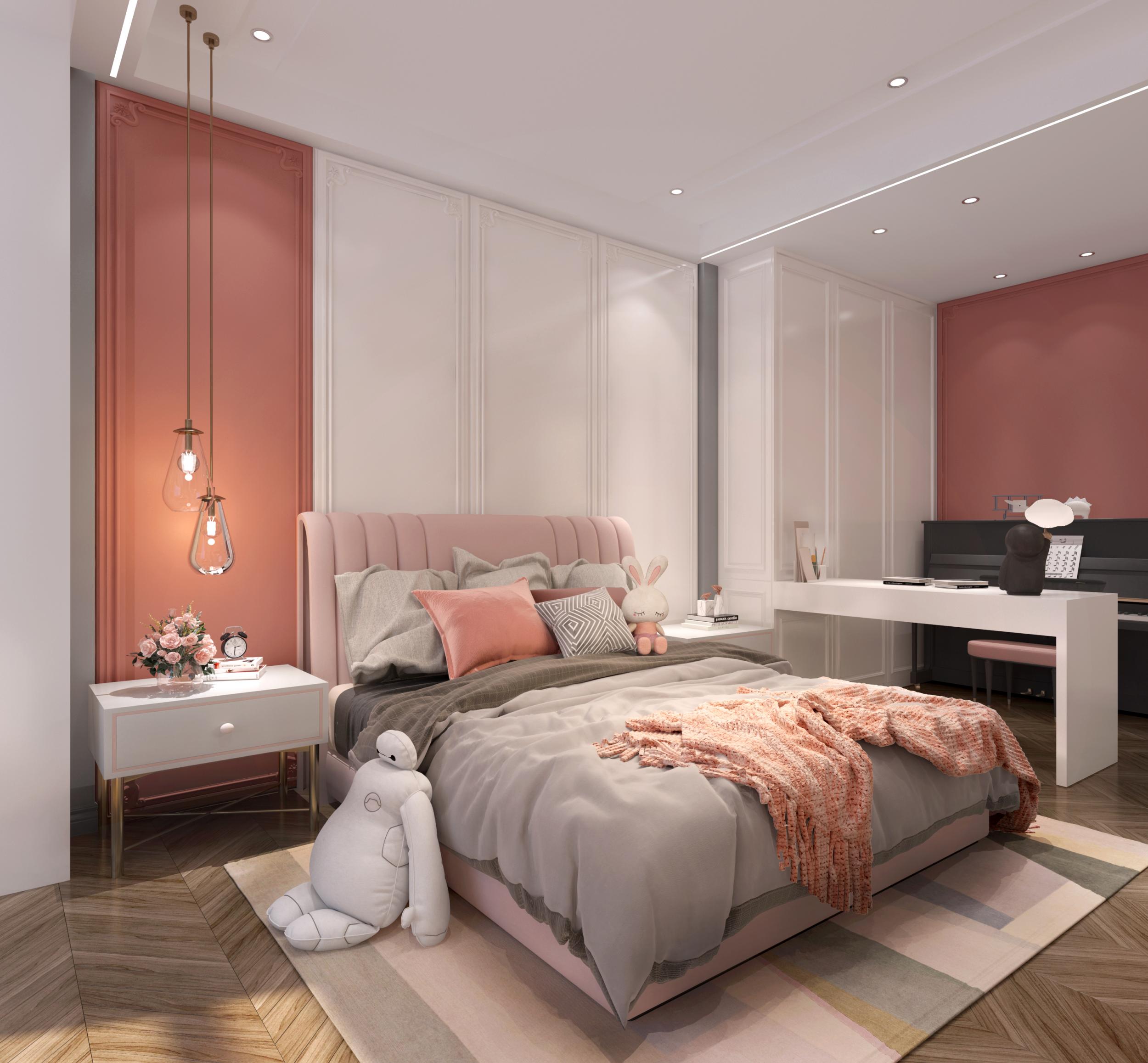 主卧以低饱和粉色与浅灰碰撞,营造温柔又不失格调的氛围。定制软包床头墙搭配同色系床具,浅灰艺术漆背景墙嵌入金属线条,提升精致感。两侧复古吊灯垂坠,呼应人字拼木地板的温润。靠窗打造小型阅读角,浅灰休闲椅搭配羊毛毯,晨起阅读、睡前放空皆适配,定制走入式衣柜分区收纳,玻璃展示区陈列私人物品,彰显生活品味。