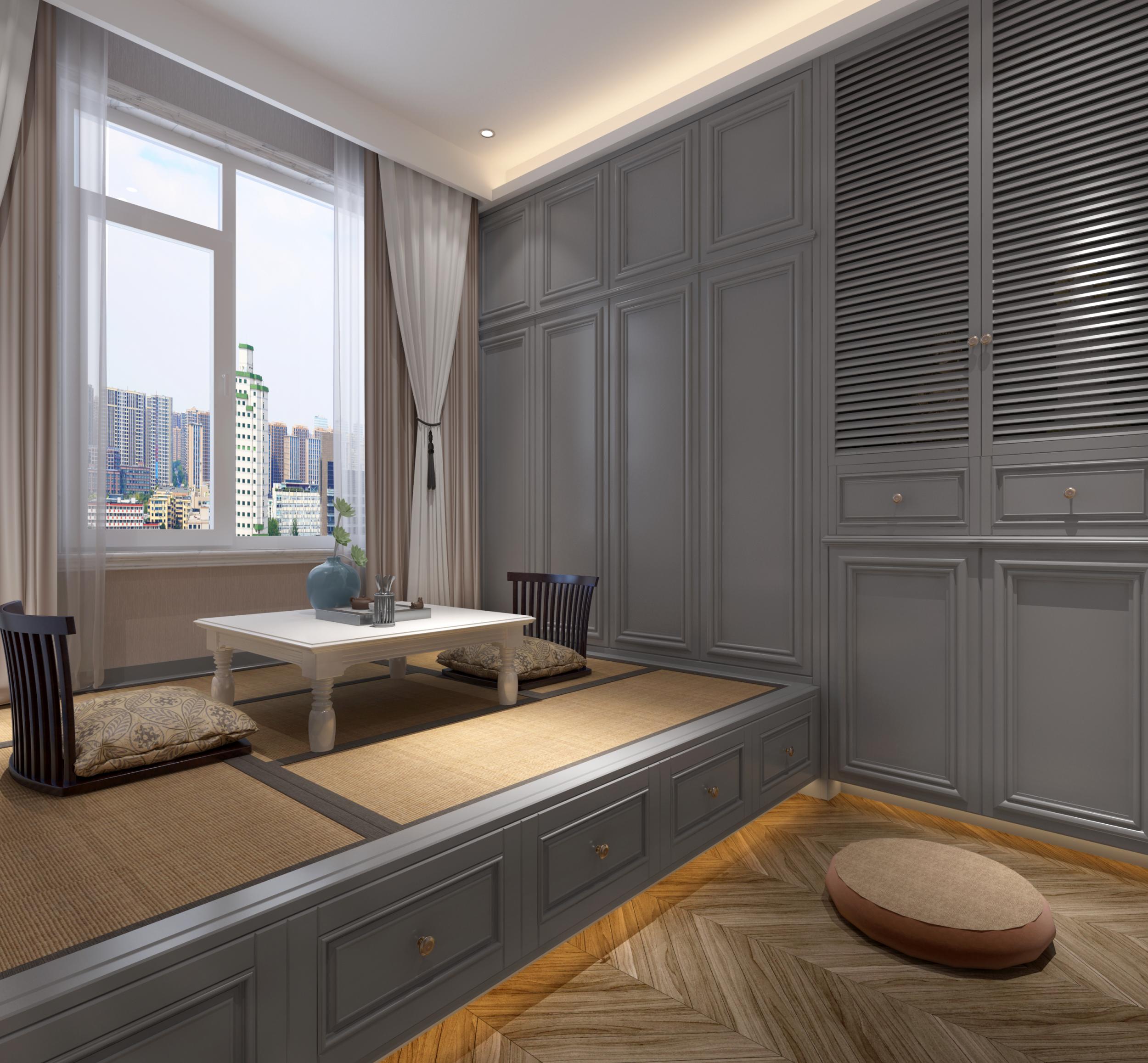 多功能室以深灰护墙板打造整体收纳系统,地台榻榻米结合抽屉,拓展储物空间。中间矮桌可自由移动,日常作为茶室,铺展软垫即变亲子游戏区。靠窗设置休闲座椅,城市景观入室,搭配复古藤编椅与陶瓷摆件,营造美式休闲氛围,满足阅读、品茗、休憩等多元需求。
