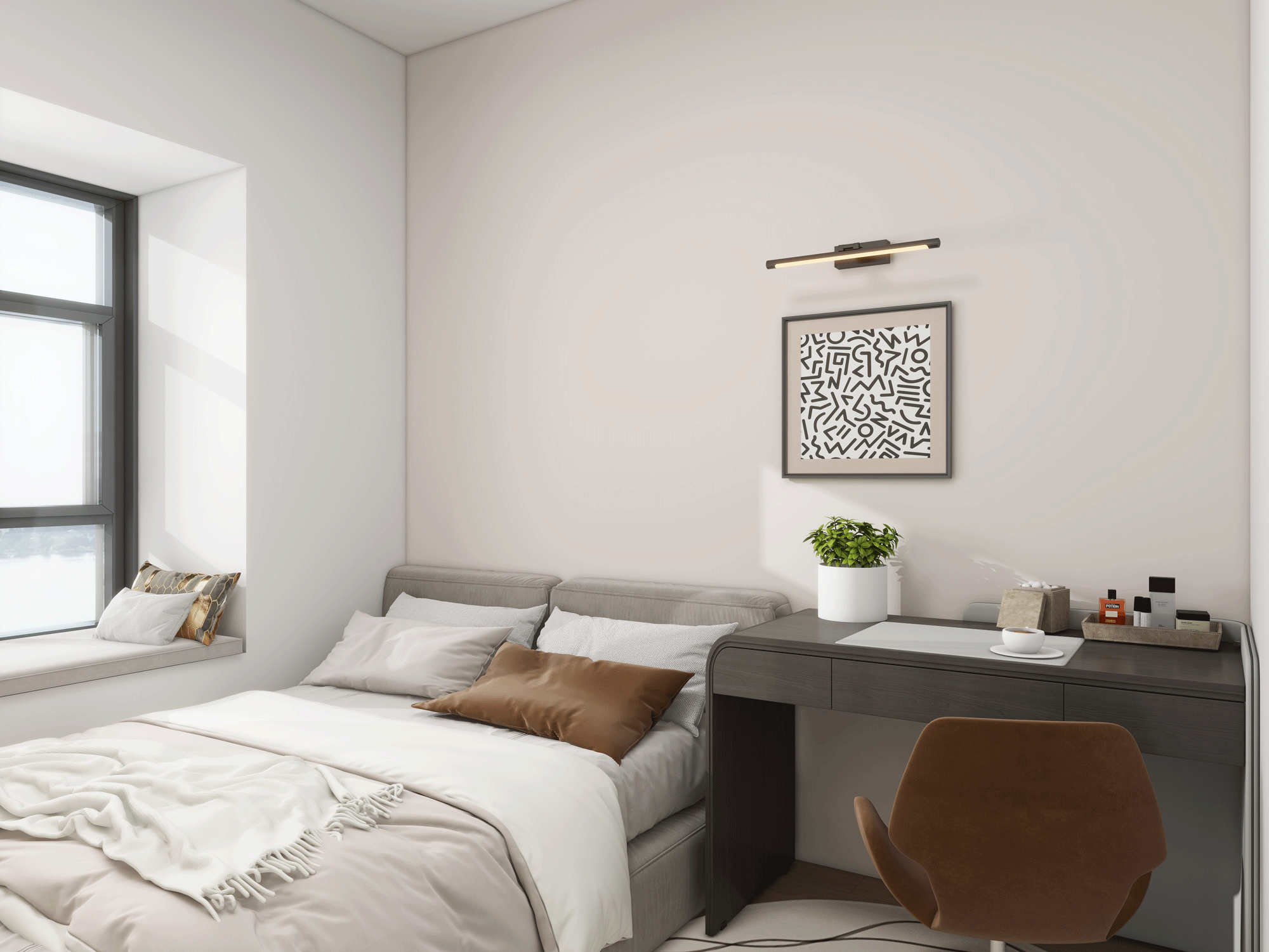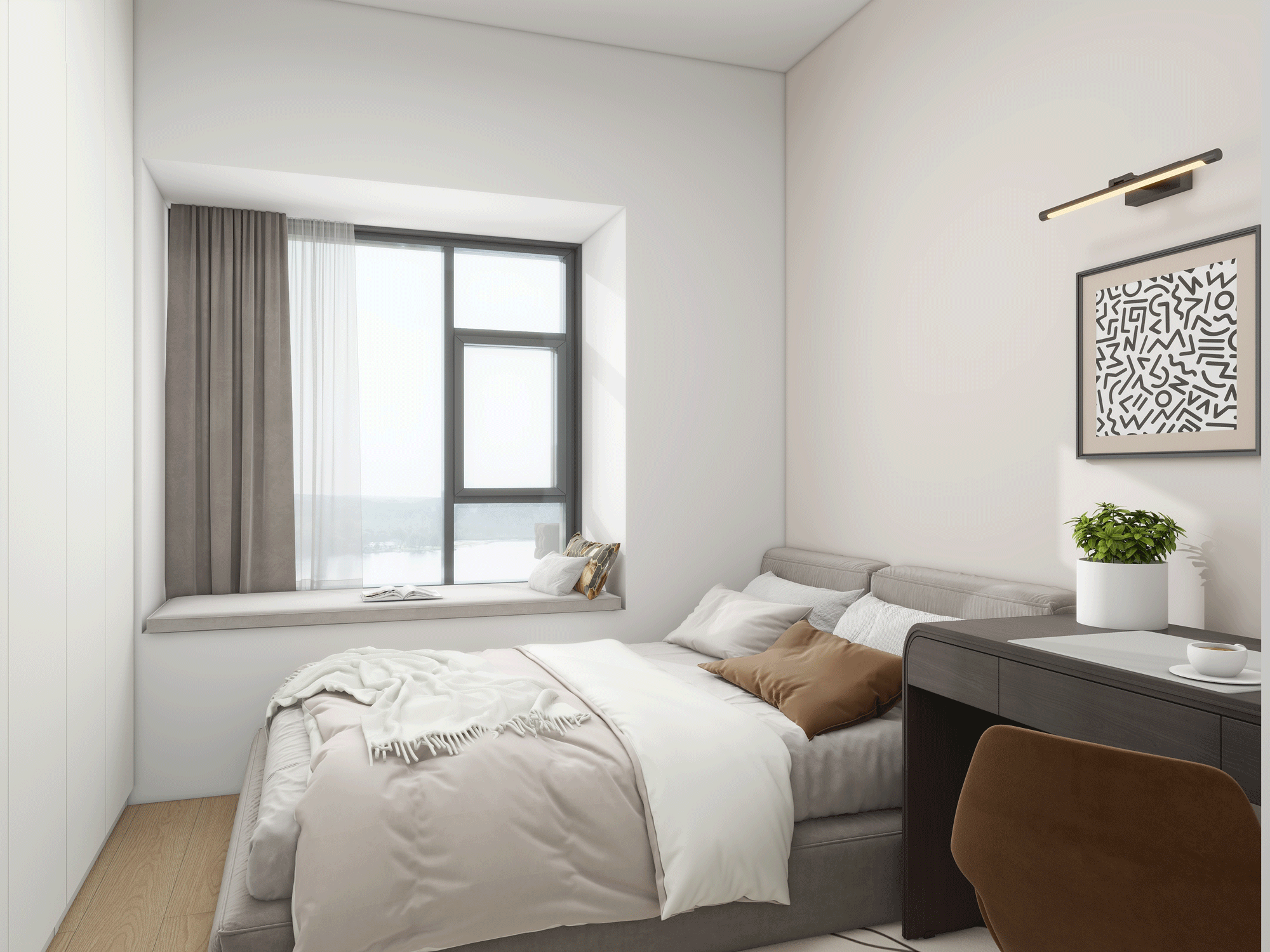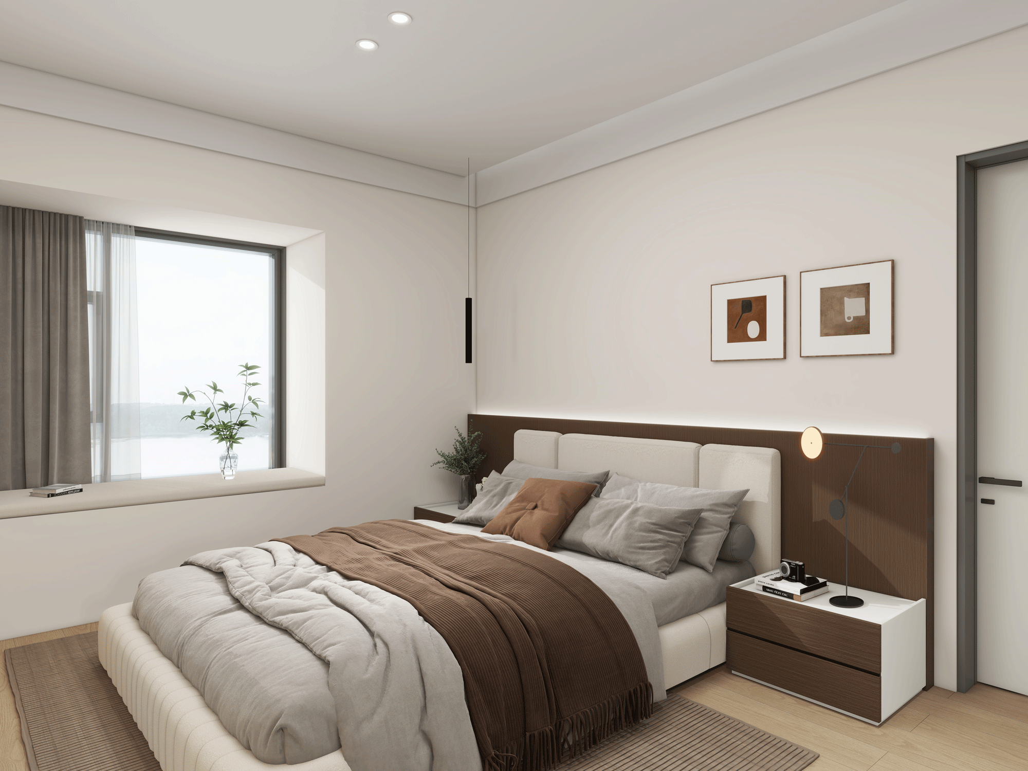 卧室延续整体色调,浅白墙与深棕床头板形成对比,搭配浅灰床品、棕色抱枕,营造静谧休憩氛围。悬浮式床头柜、线性壁灯强化简约线条,大窗保留滨海观景视野,让睡眠空间在 “简雅” 中,藏着对自然的呼应,实现 “枕浪而眠” 的诗意体验。