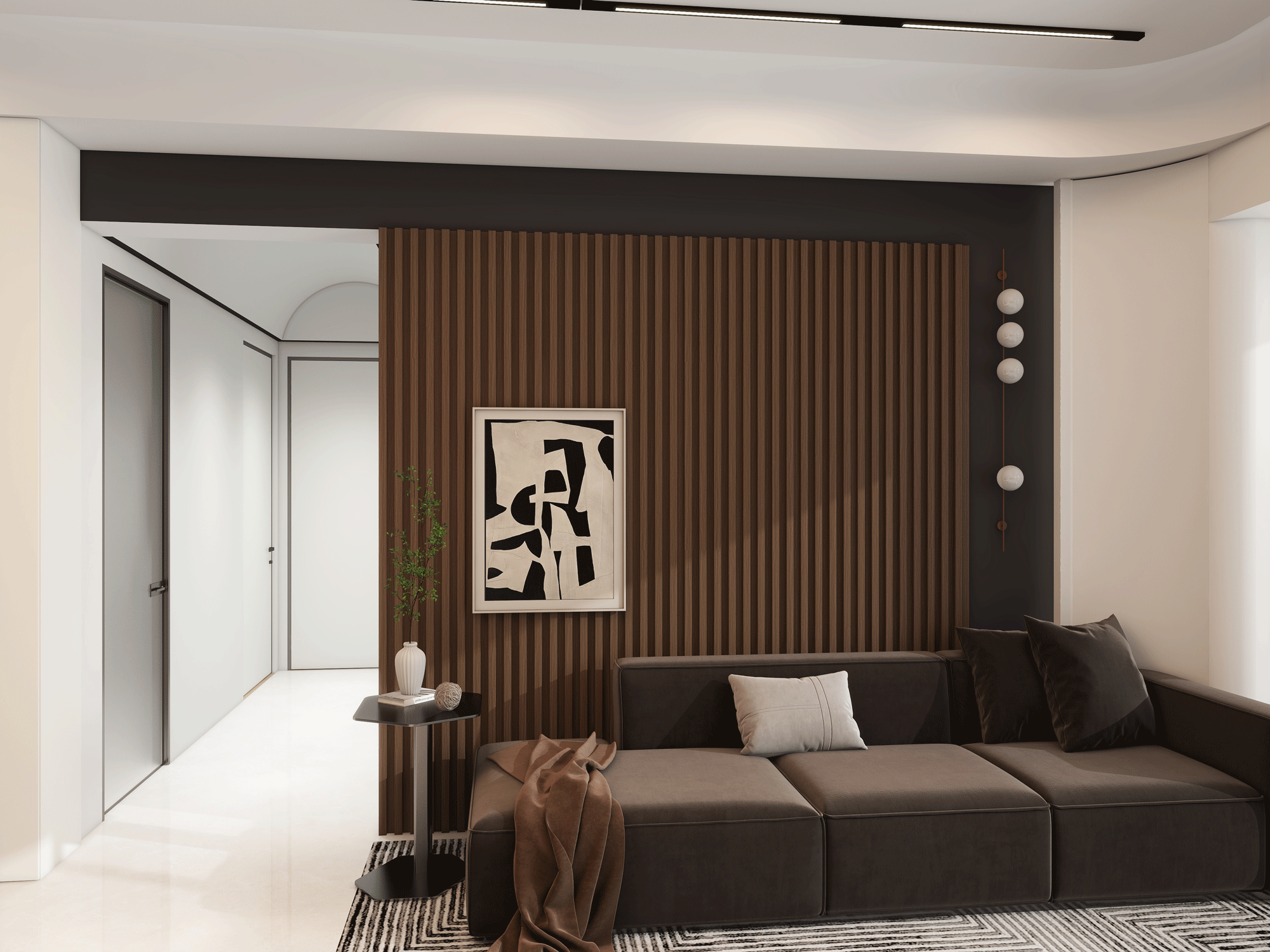 客厅以深棕格栅墙为视觉焦点,搭配深灰模块化沙发,浅棕盖毯、抱枕柔化硬朗线条。悬浮式吊顶嵌入线性灯,与墙面圆形装饰灯呼应,营造层次光感。大面积落地窗引景入室,将珠海的滨海风光与室内空间自然衔接,实现 “简约不寡淡,开阔更温馨” 的居住体验。