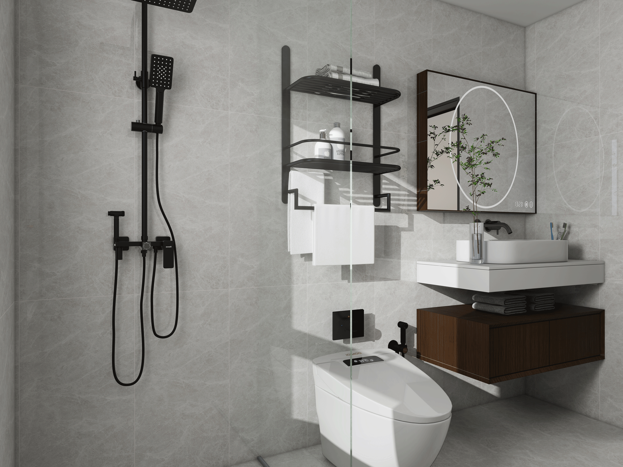 卫浴以浅灰石材为主,深黑五金件勾勒利落线条,悬浮式洗手台与智能镜柜提升实用与颜值。干湿分区明确,玻璃隔断让空间更通透,绿植点缀注入自然生机,在现代简约中,打造洁净又具温度的洗漱场景。