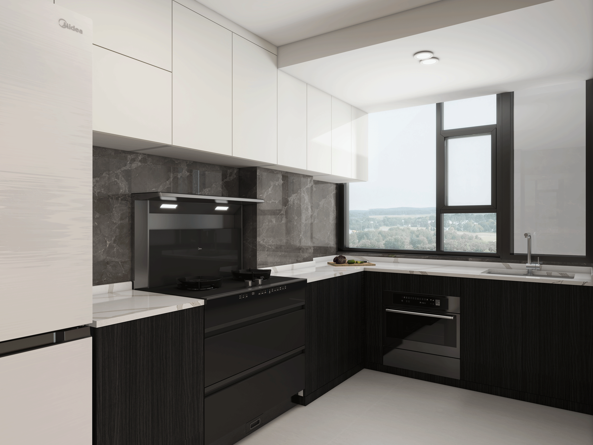 L 型厨房采用黑白撞色,浅白橱柜与深灰岩板台面利落分区,集成灶与嵌入式电器强化现代感。大窗设计让烹饪时也能远眺风景,打破传统厨房的封闭感,在简约实用中,融入滨海生活的浪漫基因。