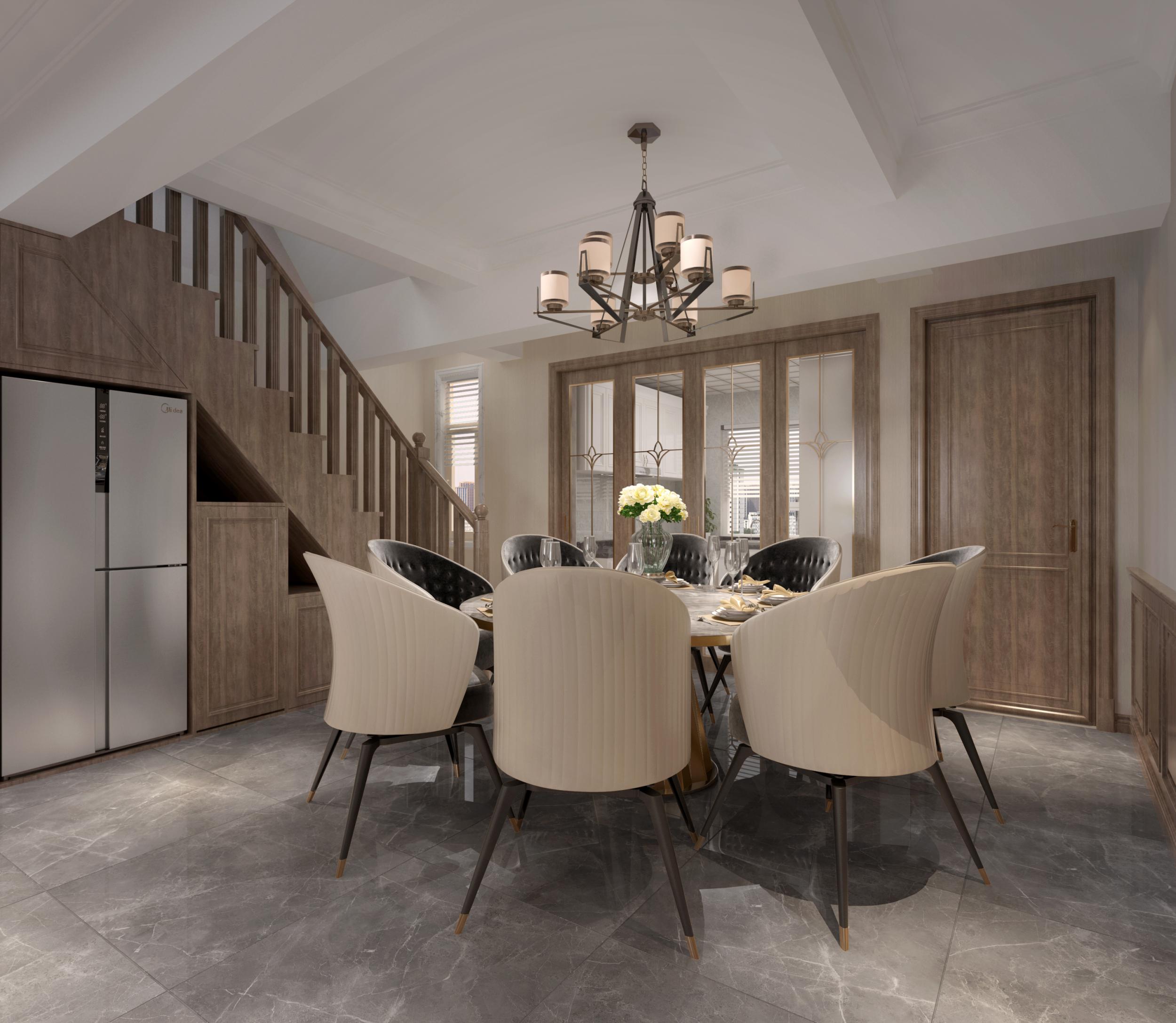 餐厅延续木作元素,实木楼梯与餐边柜呼应美式自然质感。圆形餐桌搭配皮革与布艺餐椅,混搭中见精致。复古吊灯与墙面装饰画营造用餐仪式感,通透玻璃移门连接公区,让家庭聚餐既有美式的温馨团聚,又能借景提升空间开阔感。