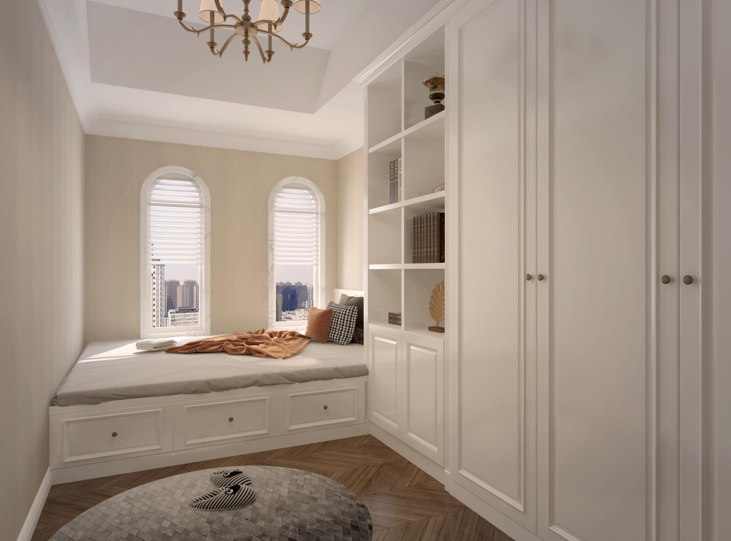 次卧以奶油白为主,弧形窗搭配百叶帘,复刻美式乡村的松弛感。定制榻榻米兼顾客卧与休闲功能,白色柜体嵌入开放格,陈列书籍与藏品。复古小吊灯与拼花地板,将美式细节融入小空间,打造 “可休憩、可阅读” 的多功能场域。