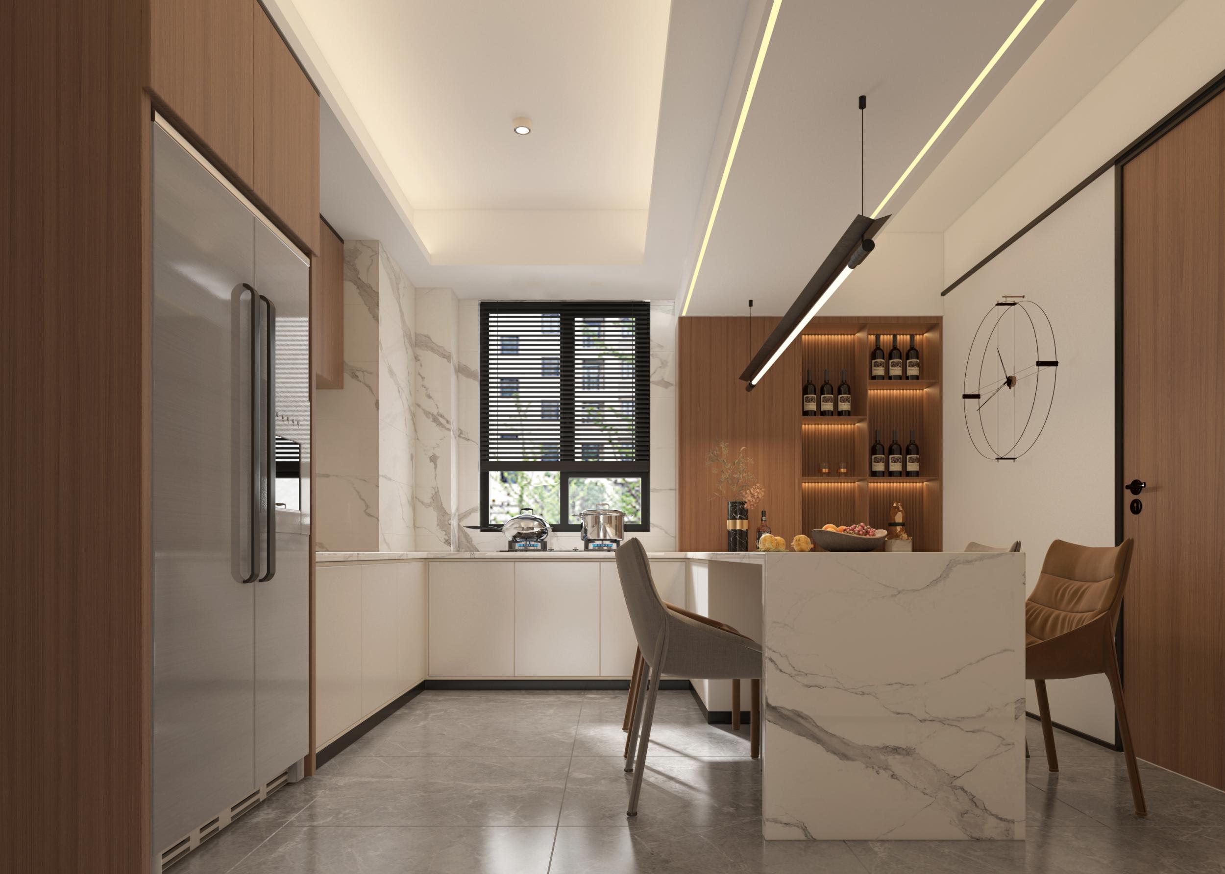 开放式餐厨区,木色柜体与大理石岛台呼应现代中式的材质融合。线性吊灯强化简约感,酒架陈列藏着东方待客之道。中厨区规整收纳,西厨岛台兼具备餐、社交功能,让烹饪与交流在 “简雅东方” 的场域中自然发生,适配滨海家庭的多元生活。