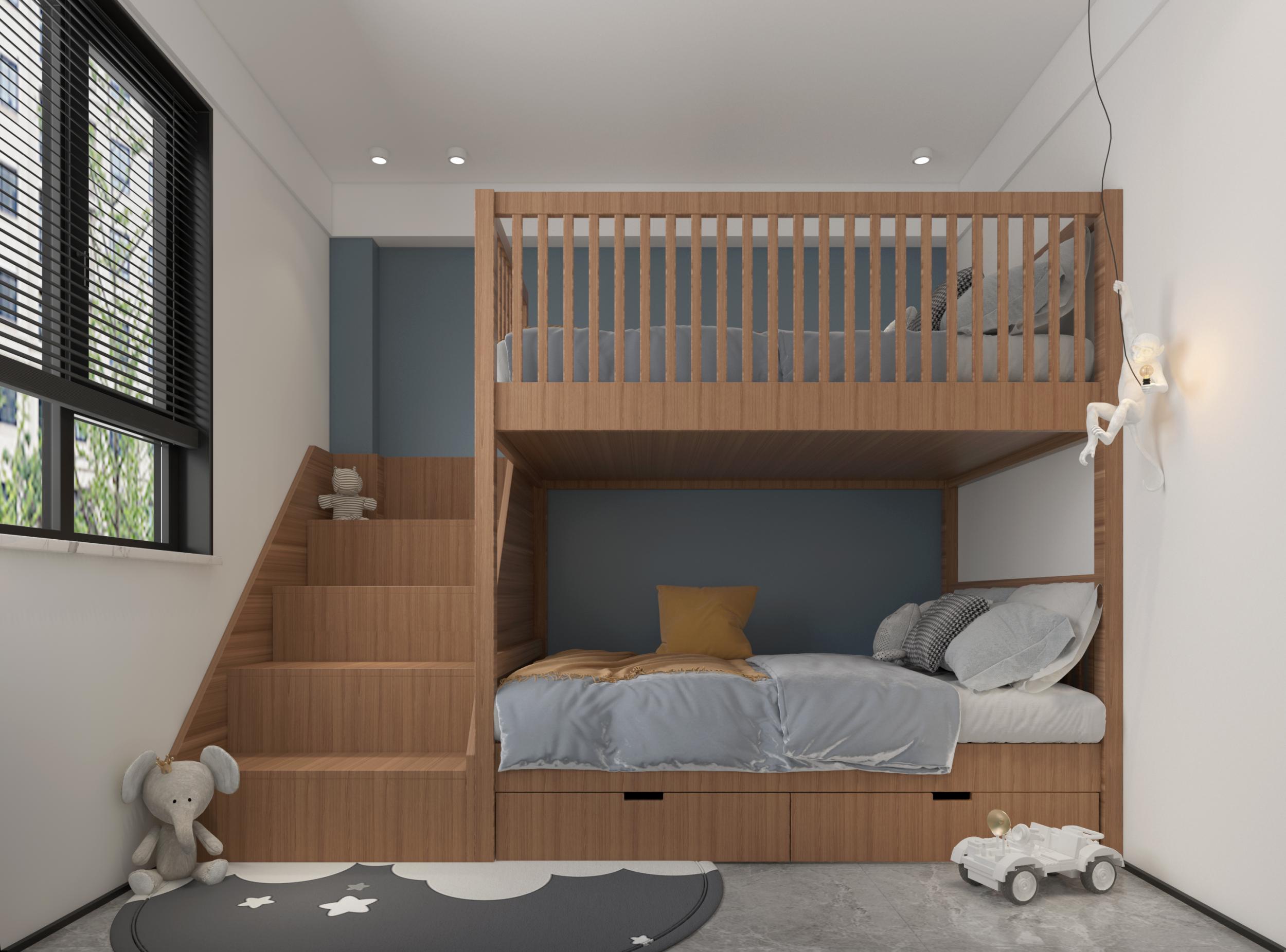 儿童房延续木色基调,双层床设计适配成长需求,楼梯与床体一体化,强化空间秩序。墙面浅蓝与白色碰撞,营造清新氛围,毛绒玩偶、小汽车点缀童趣。中式简约的线条与现代儿童生活功能结合,打造 “安全、有趣、具东方温度” 的成长空间。