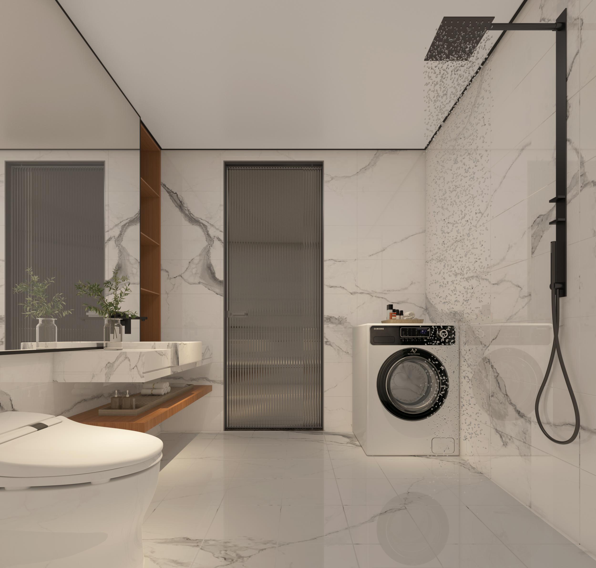 卫浴以大理石纹理铺陈,木色置物架融入中式自然质感。黑框玻璃门、金属花洒勾勒利落线条,洗衣机嵌入实现功能整合。镜前绿植点缀生机,在现代简约的实用中,藏着中式 “以自然为饰” 的美学基因,打造洁净又具温度的洗漱场景。