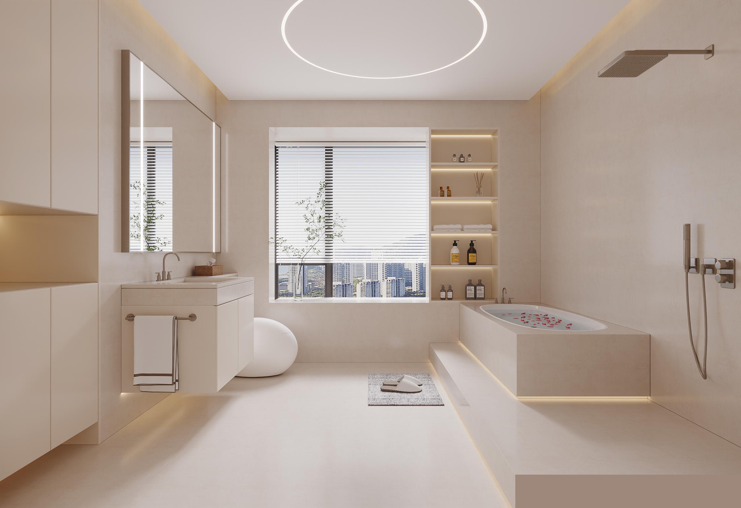 材质运用:微水泥、肤感板材、金属线条等低饱和材质组合,借细腻质感传递极简高级感,如微水泥墙面的温润、金属收边的精致;