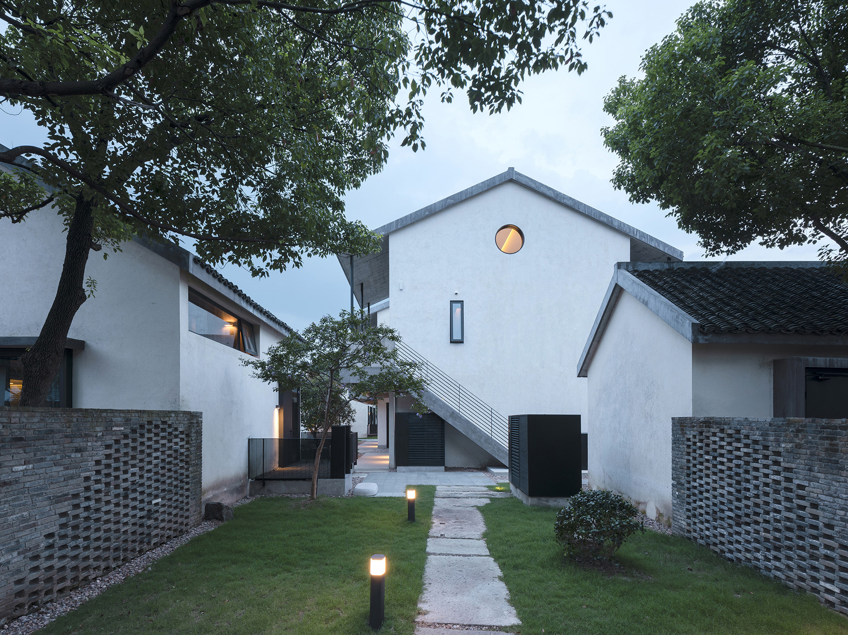 民宿庭院区:保留传统民居白墙黛瓦元素,结合现代简约线条,圆形窗洞、简洁立面赋予建筑新中式禅意气质。以青石板小径串联民宿单元,搭配原生绿植、低矮竹篱,营造曲径通幽意境。庭院灯简约造型,夜晚柔和灯光与建筑窗内暖光呼应,打造宁静温馨乡村夜居氛围,让宾客沉浸式感受自然与建筑融合之美。