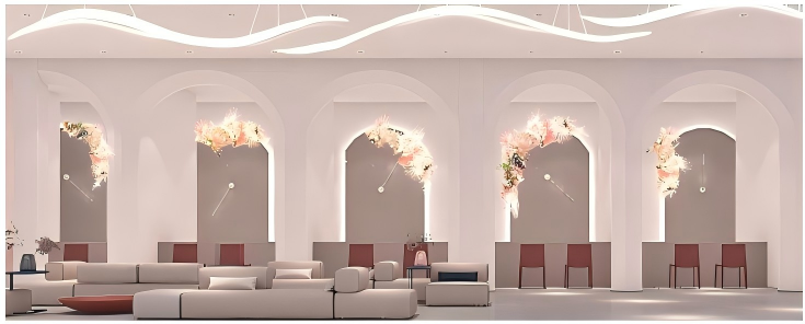 艺术打卡区:运用现代浪漫风的创新空间设计,以多个弧形拱门构建序列感。拱门内嵌艺术花艺装饰,将自然浪漫与空间艺术融合,寓意爱情的永恒。浅色调基底搭配简约现代沙发座椅,满足新人拍照打卡与休息交流需求,让浪漫艺术氛围贯穿登记全程,助力新人留存甜蜜回忆。