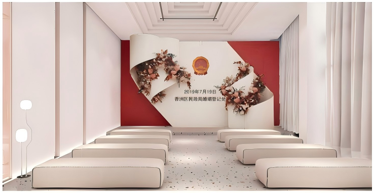 庄严颁证区:聚焦婚姻登记的仪式感,以现代简约手法融合庄严与浪漫。红白主色调凸显神圣,弧形卷轴造型打破常规墙面形态,搭配精致花艺缠绕,环绕颁证标识与纪念日期,象征爱情的延展与圆满。整齐排列的简约白色坐榻,为亲友观礼提供舒适空间,顶面线性灯光与简洁造型,烘托出庄重又不失温馨的颁证氛围,见证新人步入婚姻的关键时刻。