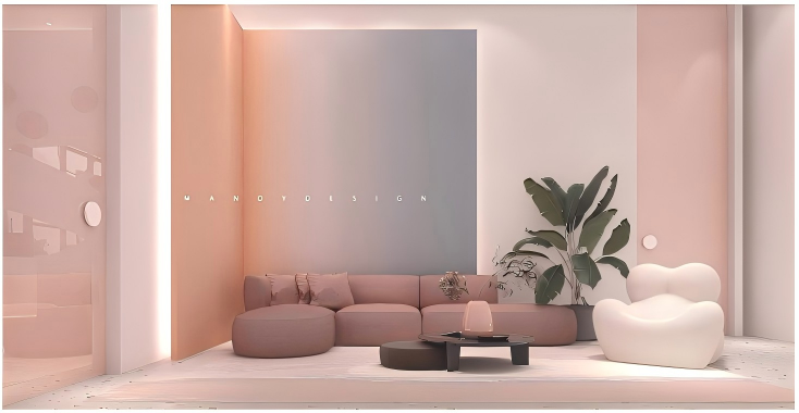温馨等候区:采用现代浪漫风典型的柔和低饱和粉棕色调,构建治愈氛围。流畅弧形沙发搭配圆润单人椅,柔软亲肤材质传递舒适触感。墙面以渐变色彩衔接,线性灯光勾勒空间层次,“MANDY DESIGN” 字样作为简约装饰,大型绿植注入自然生机,让新人在等候时沉浸式感受松弛浪漫,为登记流程预热幸福情绪。