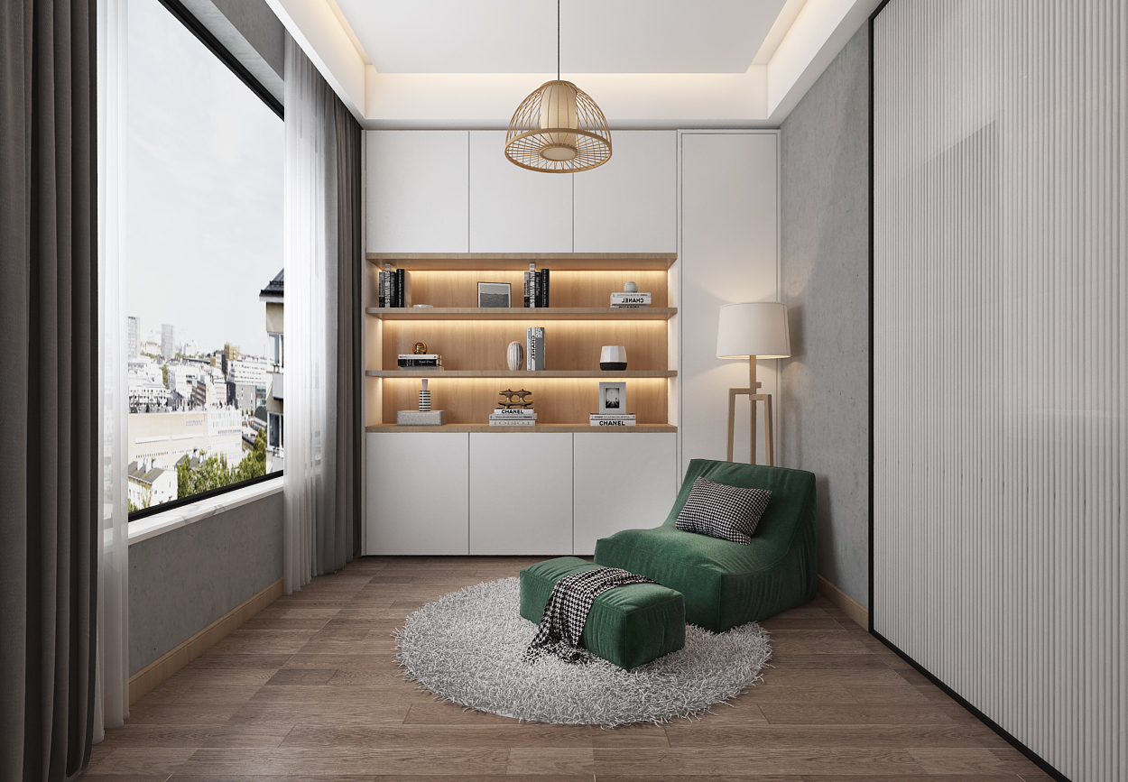 作为户型 “灵活空间”,休闲阅读区以浅灰墙面、木质地板为底,白色柜体 + 开放书架分区清晰,暖光灯带营造温馨氛围。绿色单人沙发、脚凳组合适配阅读、休憩,圆形地毯柔化空间边界;大面积窗户引入城市风景,让 “阅读时光” 与 “简约美学” 交融,诠释现代简约的 “功能拓展性”。