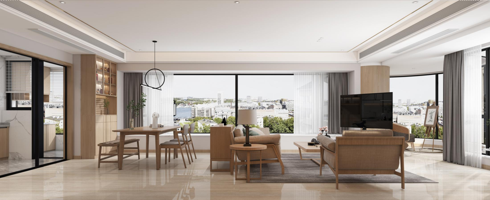 客餐厅以 “通透、互动” 为设计核心,浅色系地面与墙面延伸空间广度。客厅选用原木色沙发组合,搭配简约茶几、边几,营造温润氛围;餐厅木质餐桌椅与客厅呼应,简约环形吊灯点缀,强化风格统一。大面积落地窗引入充足光线与城市景观,开放式布局让家人交流、休闲场景自然融合,诠释 “现代简约的空间通透哲学”。