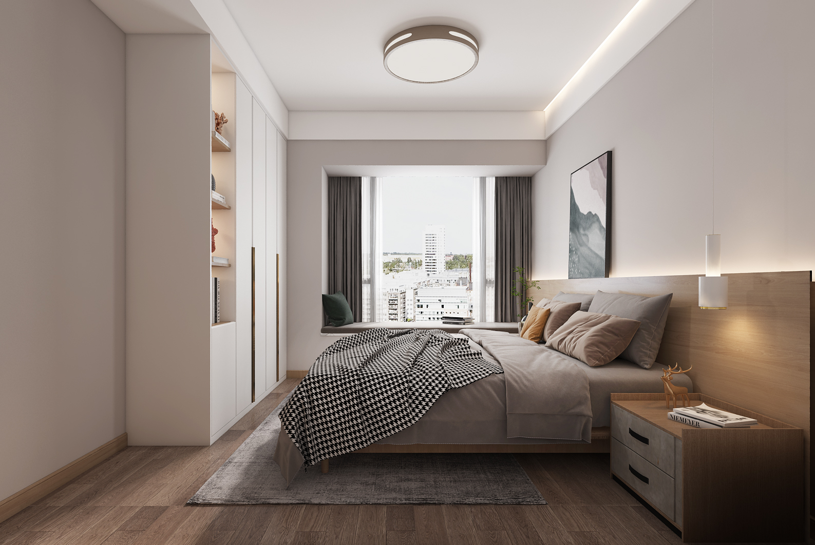 主卧聚焦 “舒适、静谧”,浅色系墙面与木质床头背景营造温馨氛围。简约吸顶灯、线性灯带组合满足照明需求,无主灯设计强化空间简洁感。床品选用质感面料,抱枕组合丰富层次;靠窗设置休闲榻,适配阅读、观景,嵌入式衣柜 + 开放格收纳,让 “休憩空间” 兼具实用性与简约美感,传递现代简约的 “品质生活观”