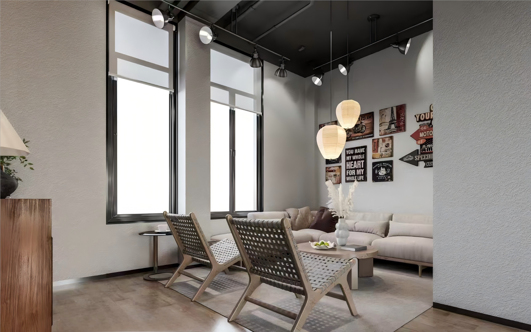 私密洽谈区:落地窗边,编织椅与小圆桌静立。自然光透过卷帘,与暖调纸灯交融,打造柔和氛围。复古海报与木质边几呼应,中和工业风粗犷,契合轻商务洽谈场景。