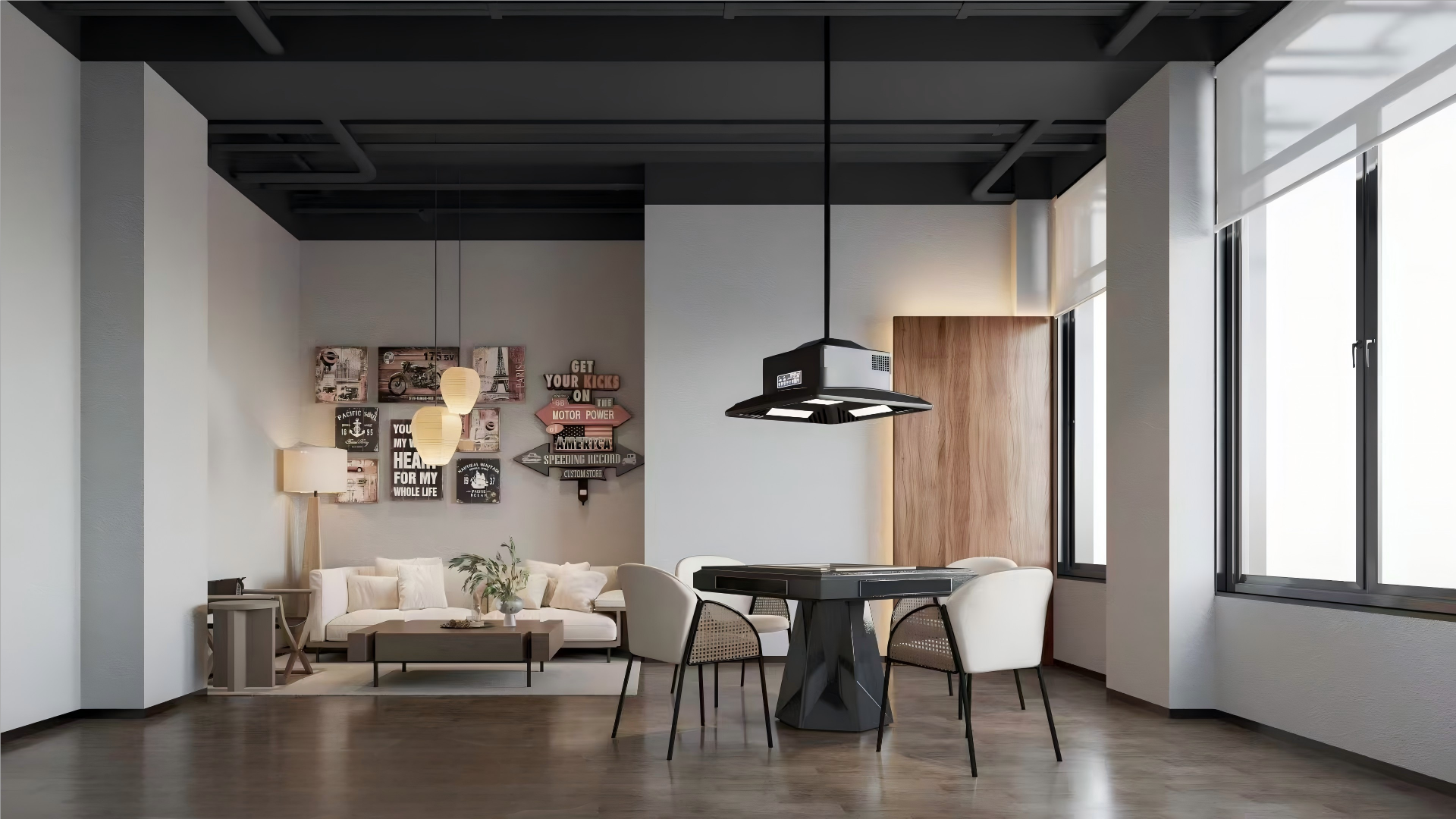 棋牌休闲区:深灰裸露顶面与黑色管线,彰显工业基因的硬朗。搭配金属质感的工业风吊灯,尽显粗犷。米白沙发、木质茶几中和冷硬,复古海报墙增添故事感,让棋牌娱乐氛围更显轻松惬意。