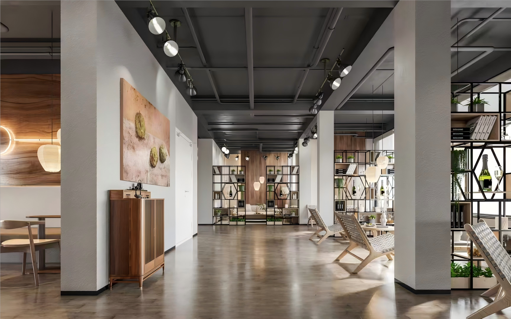 风格碰撞:工业风 “理性框架”(管线、灰调)承载复古元素 “感性记忆”(海报、木质),打破商务空间刻板印象;