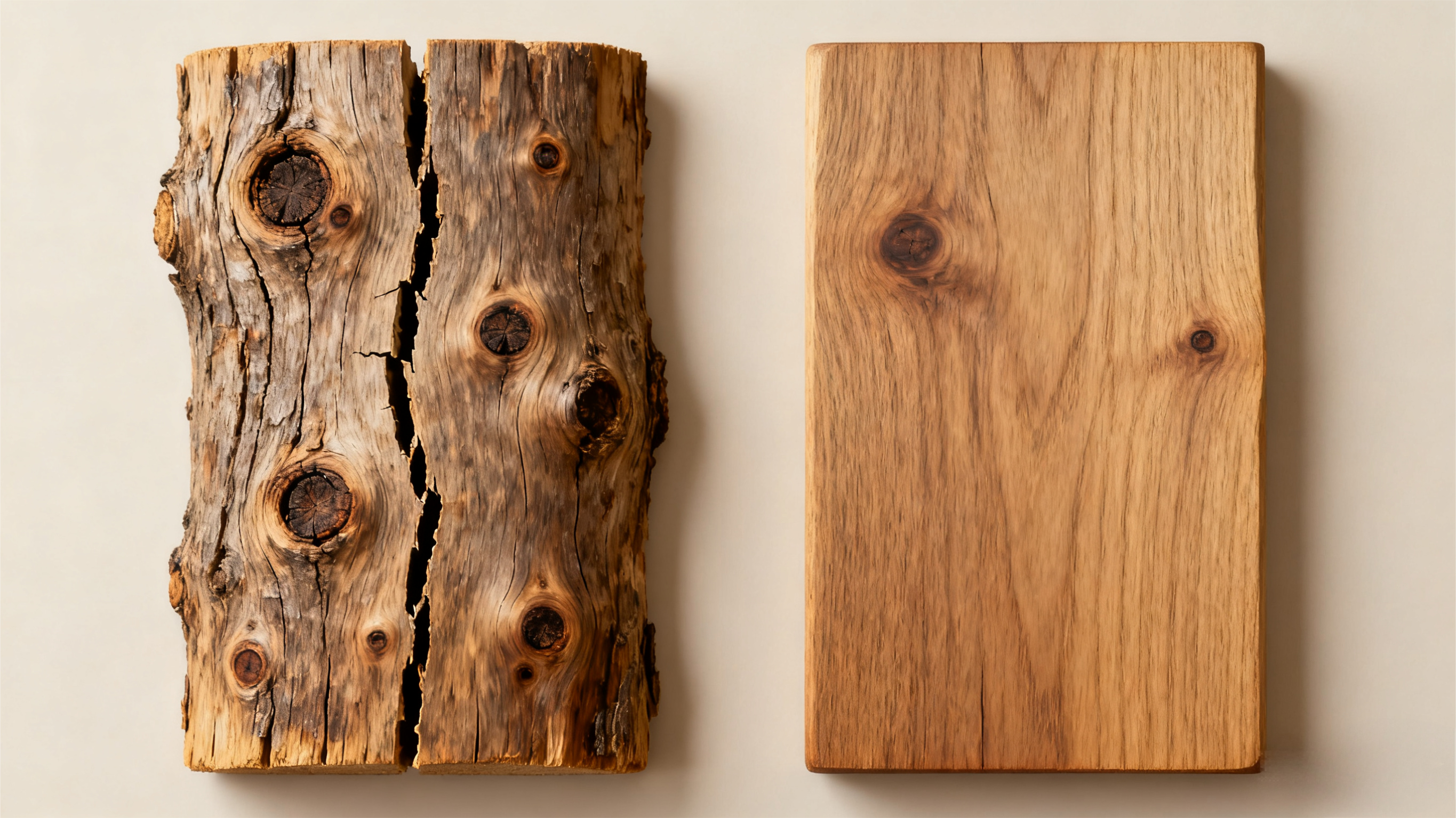 劣质木材:疵病密集,比如大面积节子、贯穿性裂缝、明显翘曲,这类木材强度差,做成家具易断裂、变形,还会影响美观度。