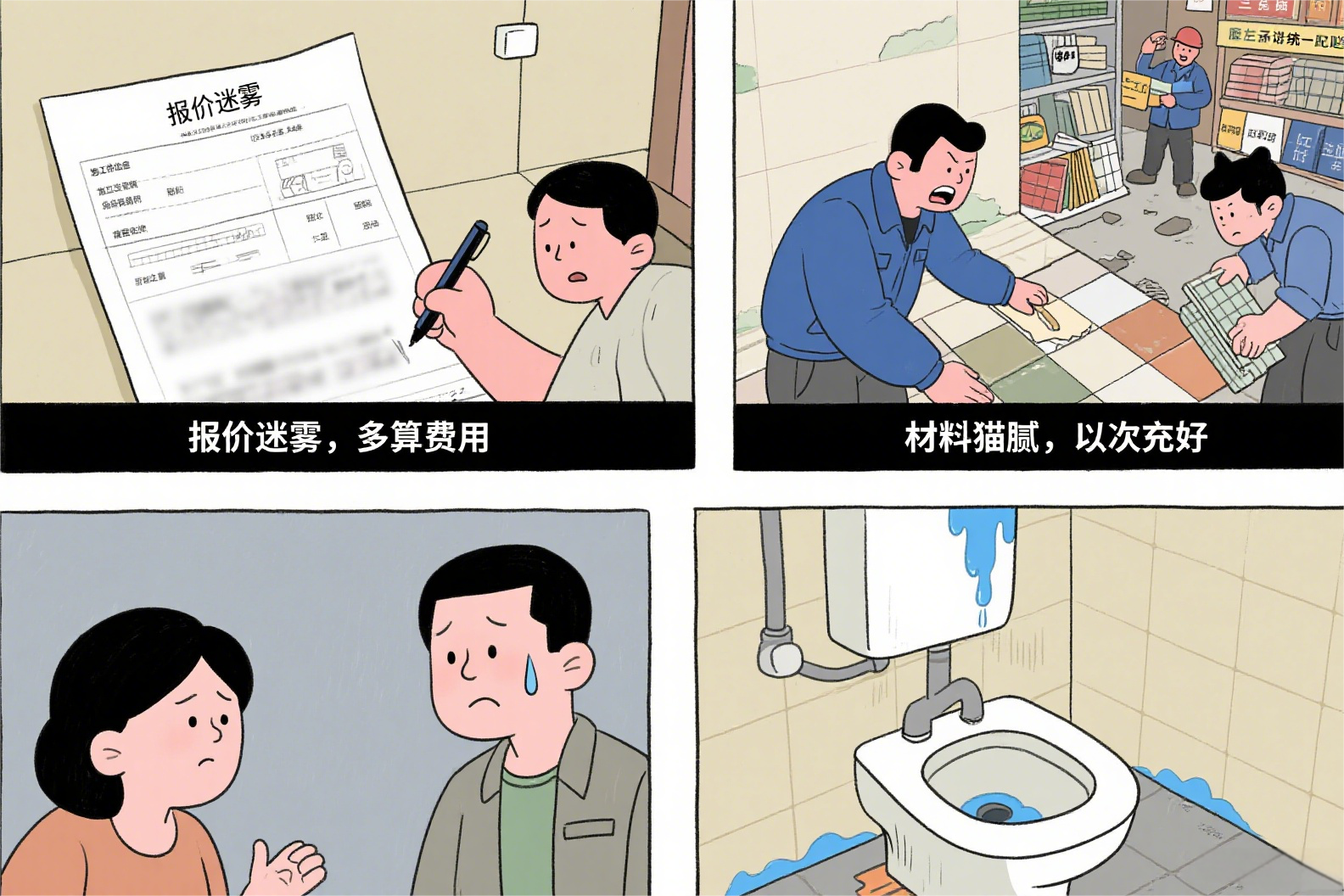 1. 报价迷雾:模糊标注「墙面处理 ×1 项」「水电改造 ×1 批」,不注明材料品牌(如用杂牌板材冒充 E0 级)、用量(虚报面积多算材料费);