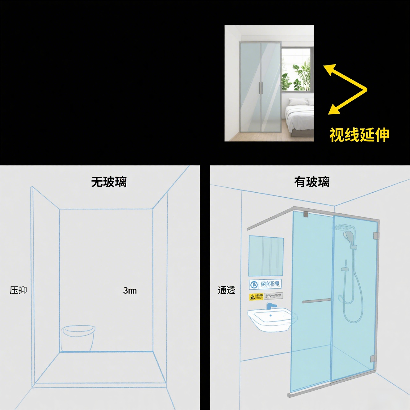 3㎡的卫生间总让人觉得压抑?用钢化玻璃做淋浴隔断(10mm 厚,防爆处理),洗澡时拉上玻璃门防水,平时敞开,整个卫生间瞬间 “变大”—— 玻璃的通透感消解了实体隔墙的闭塞,从门口看进去,瓷砖的光泽、镜面的反射,都让空间显得更开阔。