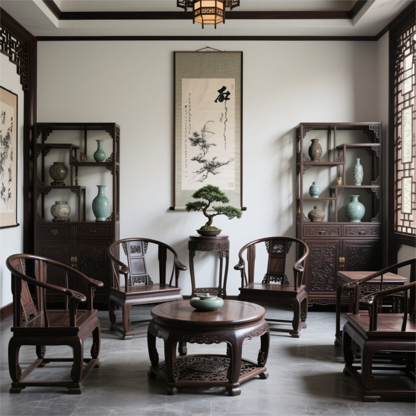 组合柜、博古架、花架这些家具,是客厅里的 “品味展台”。博古架上陈列的古玩玉器,带着岁月的包浆,诉说着主人对传统文化的热爱;组合柜里摆放的限量版酒具,搭配几株绿植,透着生活的精致;花架上的盆景或插花,无论是苍劲的松柏还是雅致的兰花,都藏着主人对自然的向往。