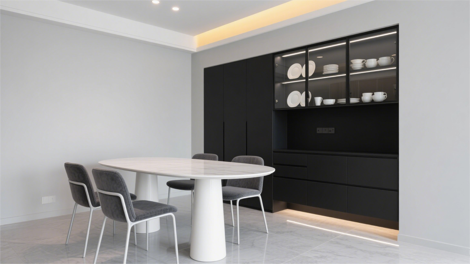 家具布置的最高境界,是与空间环境和谐共生。狭长型餐厅,可将餐桌靠墙摆放,另一侧留出走道,酒柜做成薄款挂墙式,避免占用地面空间;正方形餐厅,可让餐桌居中,四周对称放餐椅,酒柜放在餐桌一侧,形成平衡的视觉效果。