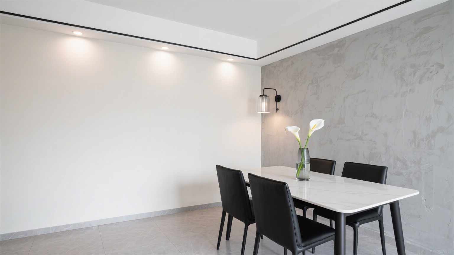 顶面的颜色需与墙面、地面协调,通常以纯白色为主,避免深色吸收光线导致空间压抑。灯光线路可提前嵌入吊顶或墙面,让顶面保持整洁,不破坏整体的简约感。