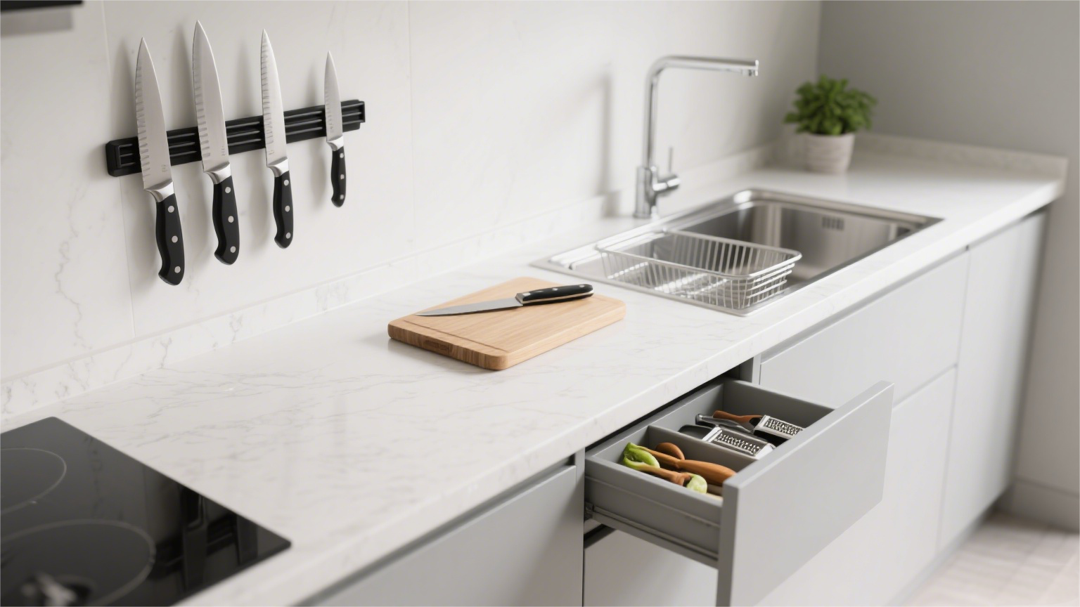 切配区的用具摆放,首重安全与顺手。刀具需固定位置 —— 贴墙安装磁性刀架,或放入带分隔的刀具盒,刀刃朝外且远离儿童可及范围,既避免磕碰受伤,又能保持干燥防生锈。刀具应放在水槽与切菜台之间,洗完的食材转身就能切,减少手部带水移动的风险。