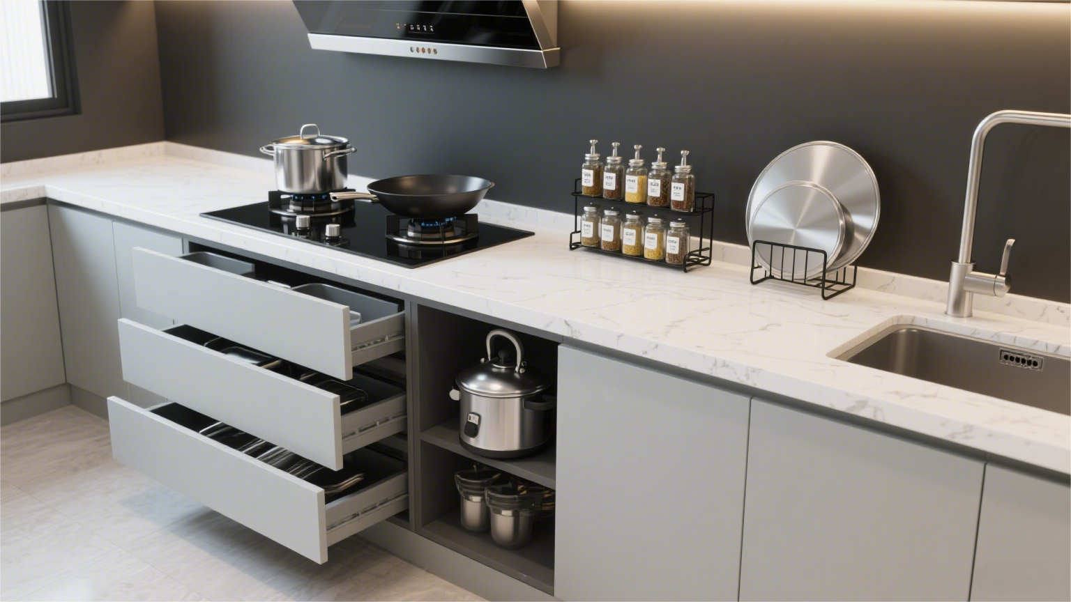 灶台周围是烹饪的 “主战场”,用具摆放直接影响翻炒效率。铁锅、蒸锅、高压锅等大件炊具,适合放在灶台下方的地柜里,按使用频率分层 —— 常用的炒锅放在最上层抽屉,不常用的蒸锅、高压锅放下层。