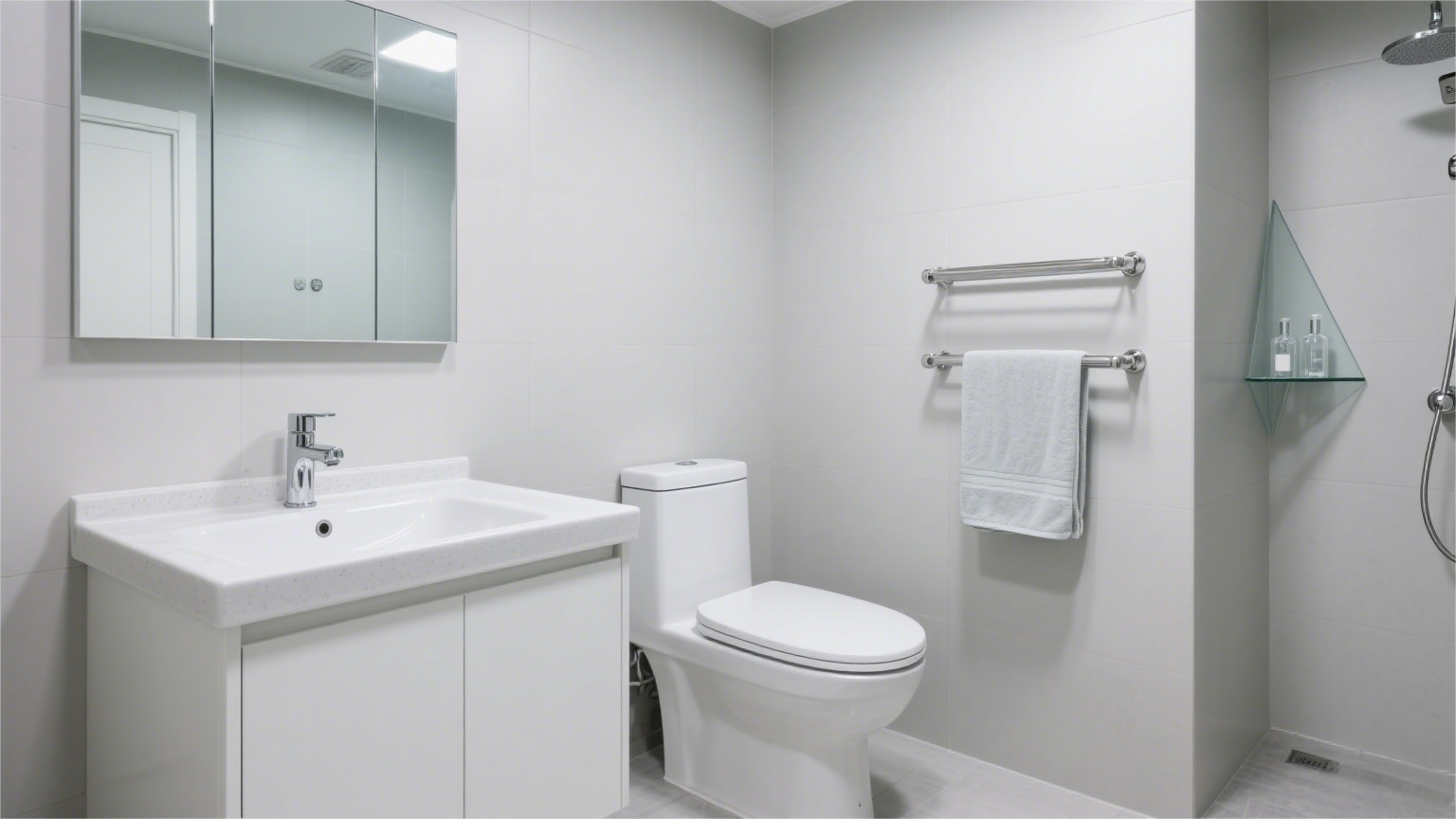毛巾杆、搁架等配件需选用玻璃、不锈钢等防水材料,造型简洁无棱角,既便于清洁又防止碰伤。玻璃搁架应安装在儿童够不着的高度,避免意外。镜子需选防雾款,确保洗澡后镜面清晰。