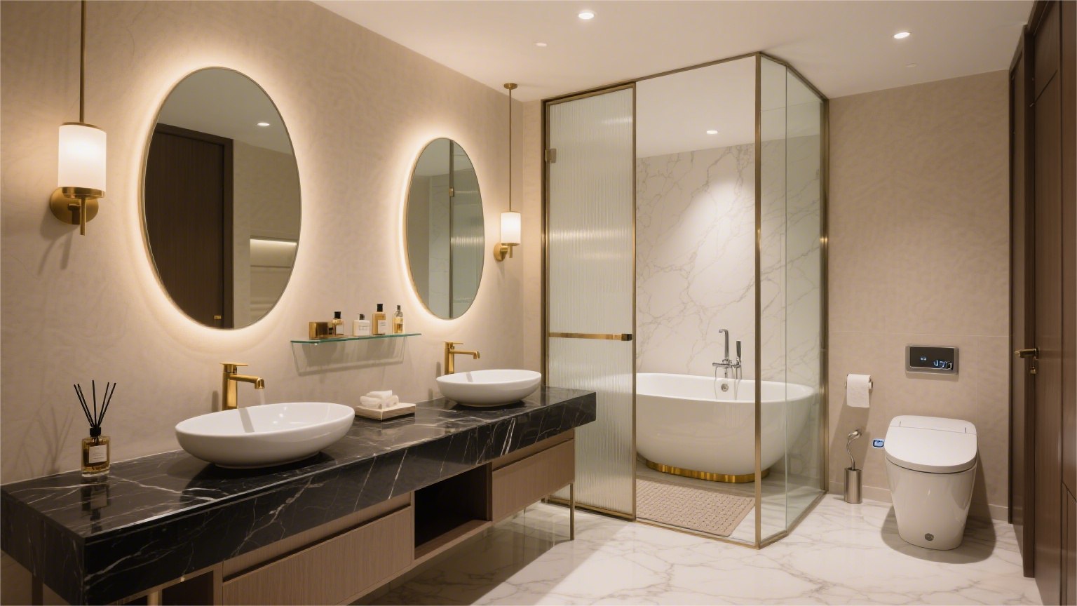 洁具可大胆选用彩色坐便器、玻璃台面洗手盆,搭配智能便洁宝提升体验;地面墙面可用大理石、哑光瓷砖等高档材料,局部嵌入金属线条或艺术砖点缀。色调可呼应主卧风格 —— 轻奢风配浅金与深灰,北欧风用莫兰迪色,新中式则融入木元素与水墨纹。