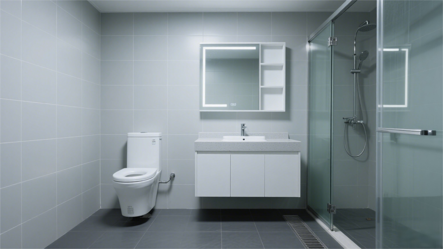 墙面地面优先选通体砖、防滑地砖等耐磨耐脏材料,接缝用防水填缝剂,减少清洁死角。色彩以柔和中性色(米白、浅灰、燕麦色)为主,既显干净又能融入整体家装风格,避免过于跳跃的色调给访客带来压迫感。
