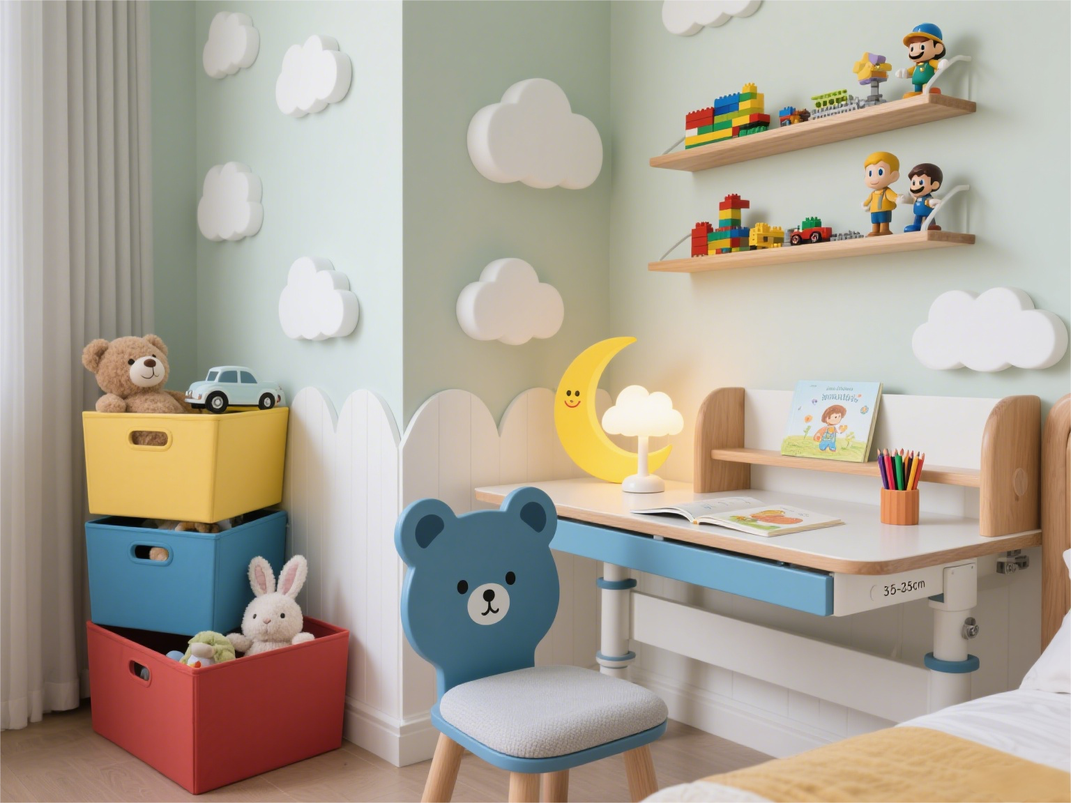 家具安全是底线:所有家具都要圆角设计,衣柜、书桌固定在墙上,防止孩子攀爬时翻倒。床的高度别太高,方便上下,床垫选稍硬一点的,对脊椎好。书桌和椅子要能调节高度,从小学用到初中都没问题。