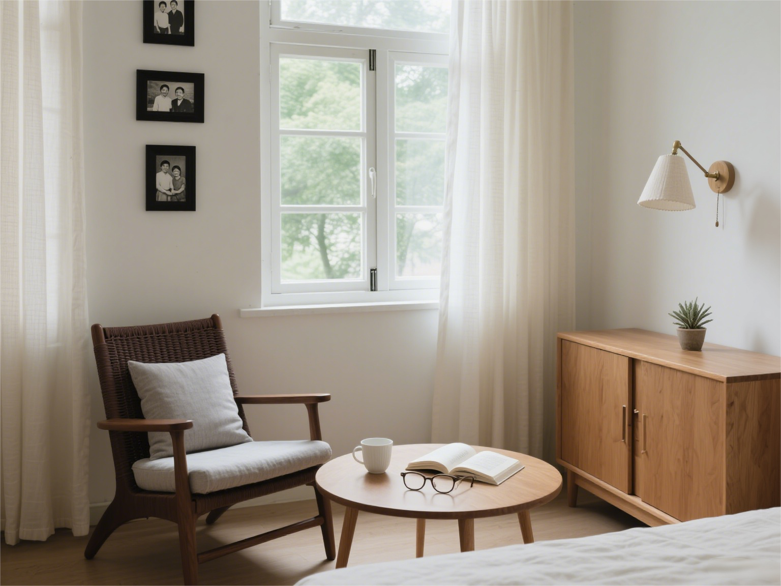 氛围要静,色彩要柔:墙面刷米白、浅灰等淡雅的颜色,搭配原木色家具,看着心里踏实。摆几盆好养活的绿植(比如君子兰、长寿花),挂一幅书法作品或老照片,既有生气又不花哨,符合老人的审美。