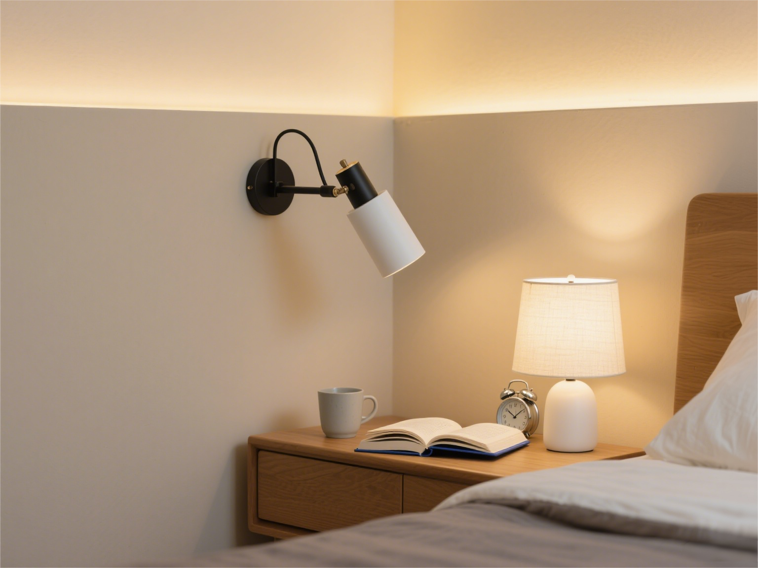 床头阅读灯:睡前翻几页书?在床头装壁灯或摆台灯都行。壁灯节省台面空间,灯臂可调节,能把光精准打在书页上;台灯选带灯罩的,避免光线直射眼睛。记住光线要 “够亮但不刺眼”—— 太暗伤眼,太亮则会让大脑误以为还是白天,影响入睡。