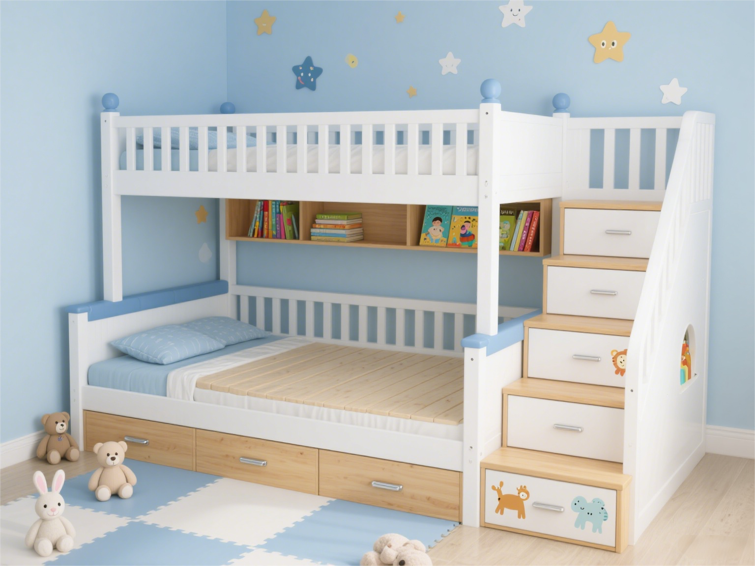 儿童房床有讲究:小孩床尽量靠角靠窗放,中间腾出空地让孩子跑跳。做高低床时,上铺高度留 1400-1600cm(够孩子坐直),边缘装≥30cm 的护栏,台阶也要加护栏,防止磕碰。