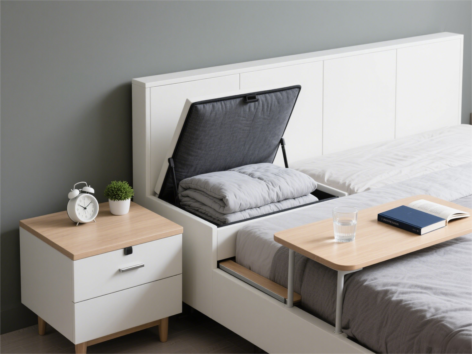 一体化设计最省地:现在很多床组自带床头柜功能,比如床头板拉开是储物箱,能塞棉被;床沿边有可滑动的小桌板,早上放早餐,晚上放书,不用单独买床头柜,特别适合小户型。