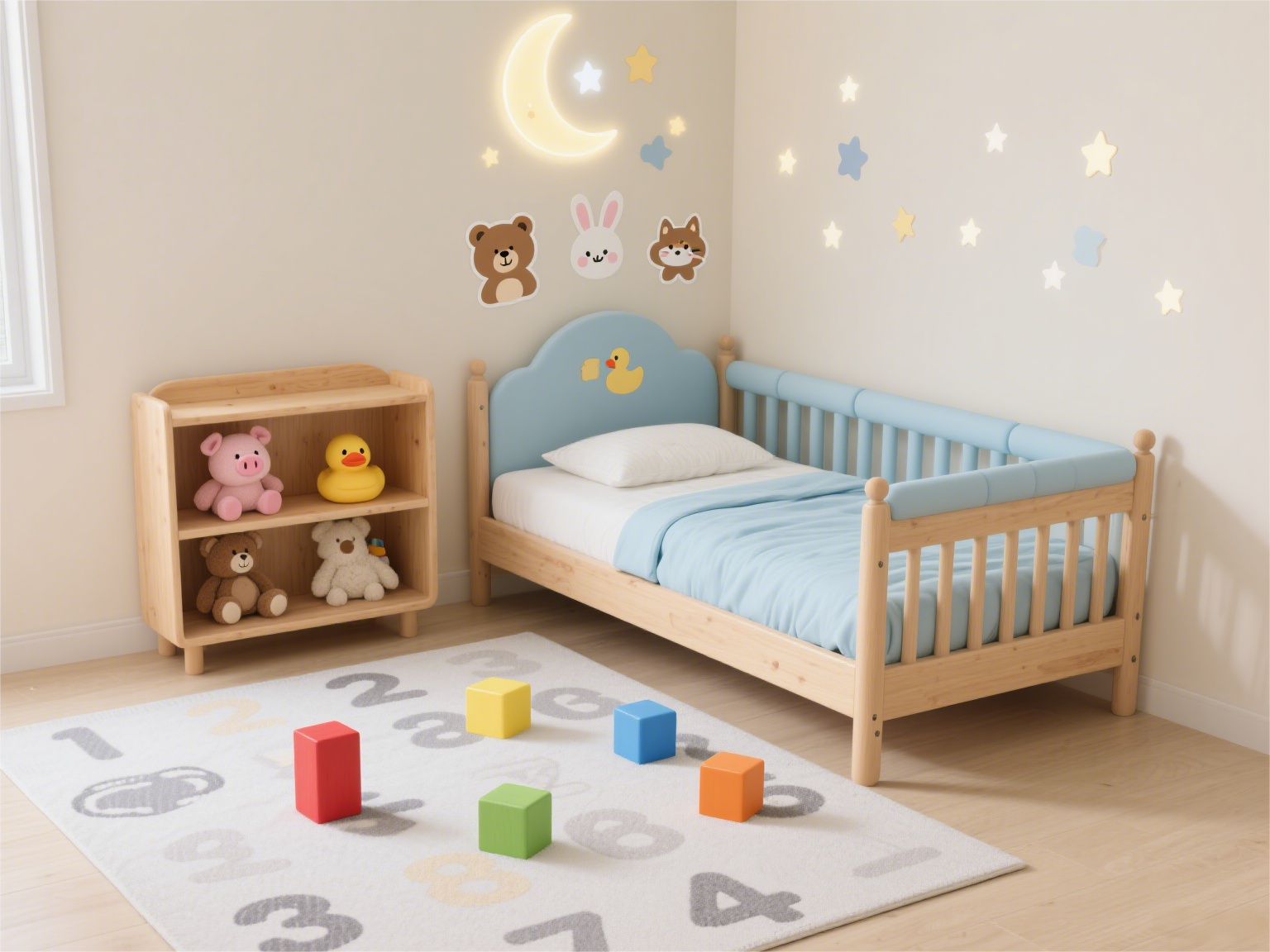 位置选在角落,远离门口:床尽量靠墙角放,避免正对门口(减少外界干扰),也别挨着窗户(防止冷风直吹)。学龄前孩子一定要用带护栏的床,护栏高度至少 30cm,缝隙小于 6cm,防止卡手卡脚。