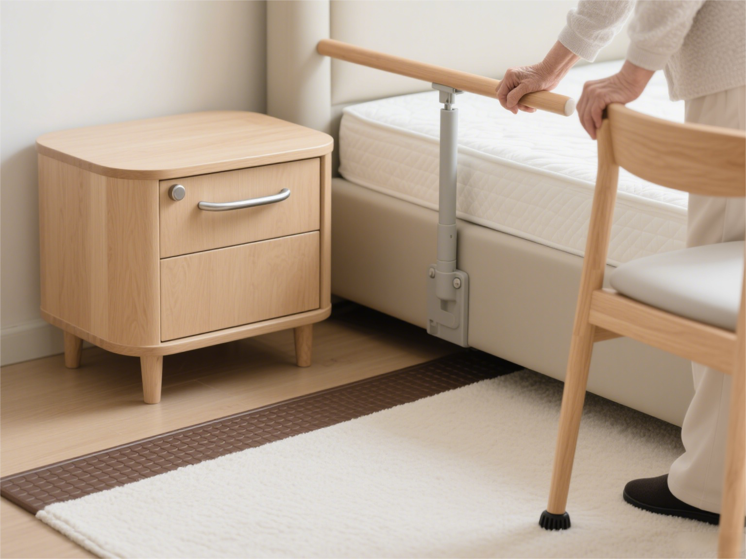 把手选粗长的弧形款,方便用力;椅子和凳子要稳,腿下装防滑垫,座面高度在 45-50cm 之间,老人坐下和站起时不用过度弯腰。床沿可以装隐形扶手,半夜起夜时能借力。